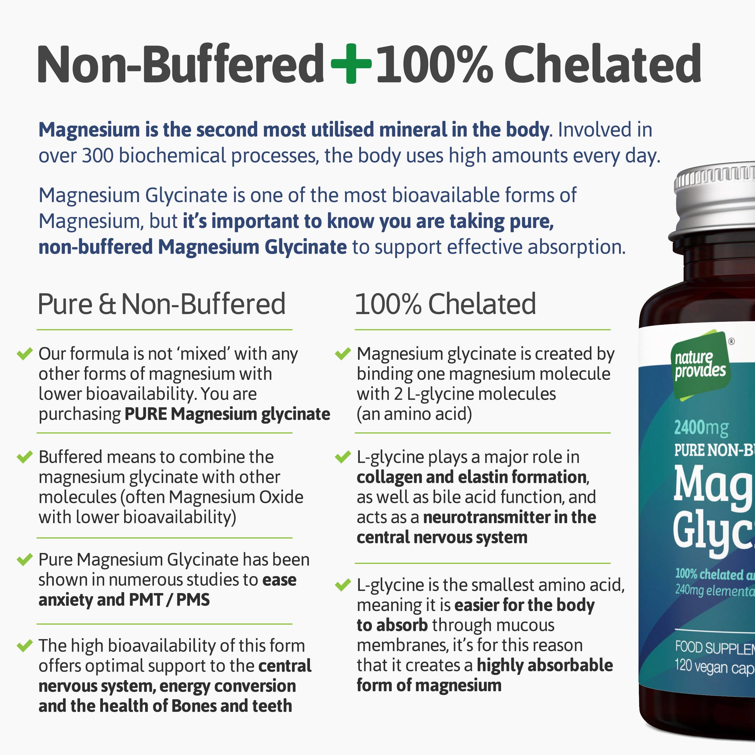 Hver porsjon på 4 kapsler inneholder 2400 mg magnesiumglycinat, som gir 64 % av det anbefalte daglige inntaket. Denne formen for magnesium kan bidra til å redusere angst og PMS-symptomer, støtte muskel- og nervefunksjon, samt fremme avslappende søvn. I tillegg kan det bidra til å redusere muskelsmerter og spenninger, og støtte bein- og tannhelse ved å forbedre bentetthet.
