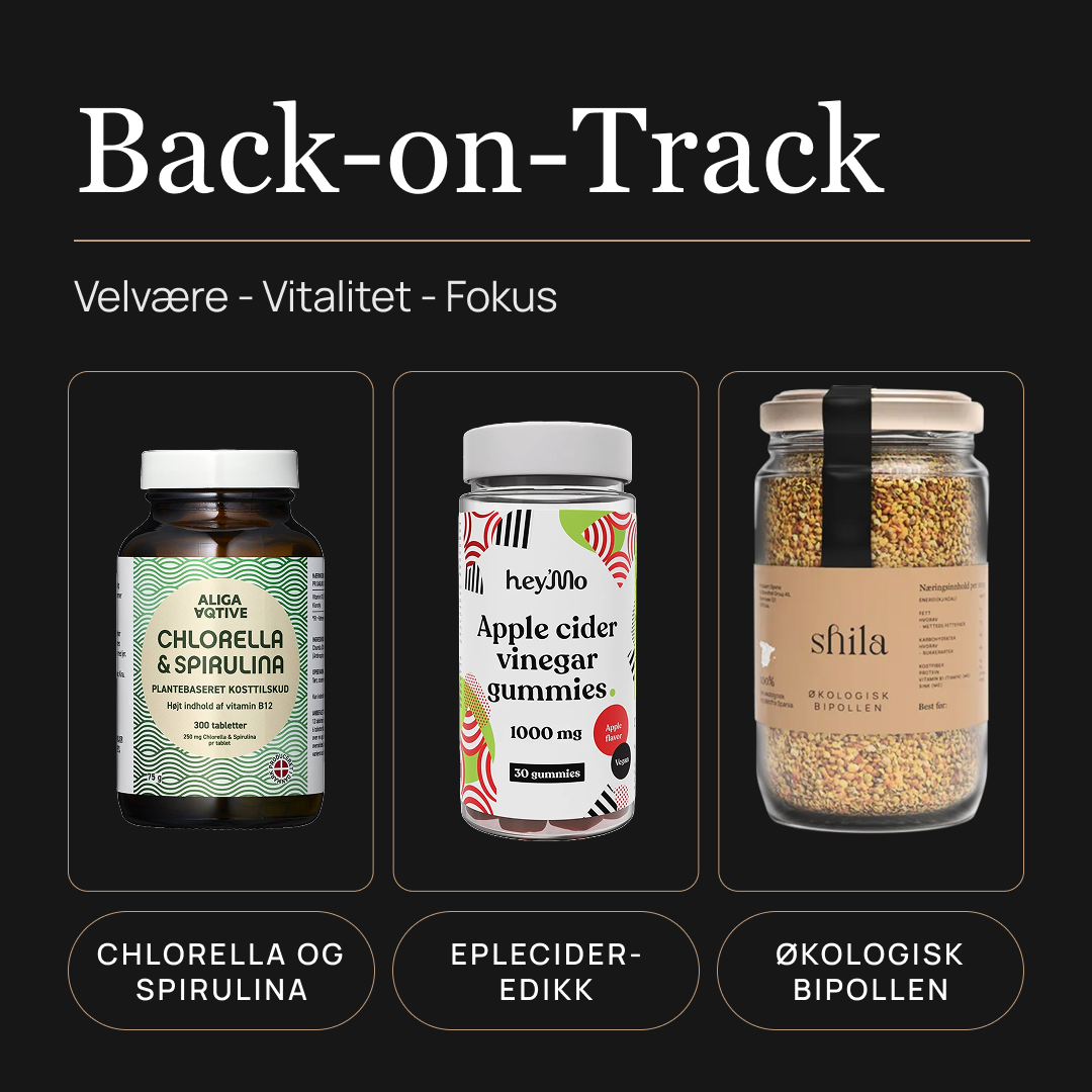 Føler du deg tung, trøtt eller rett og slett litt mett på alt etter påsken? Da er dette pakken for deg. Back-on-track-pakken er laget for deg som ønsker å komme tilbake til gode rutiner, støtte fordøyelsen og kvitte deg med påskens ekstra kilo på en naturlig og skånsom måte. Med kombinasjonen av Chlorella & Spirulina, Eplecidereddik-gummies og SHILA Økologisk Bipollen, får du hjelp til detox, mer energi og bedre balanse i kroppen – slik at du lettere finner tilbake til en sunn og energisk livsstil.