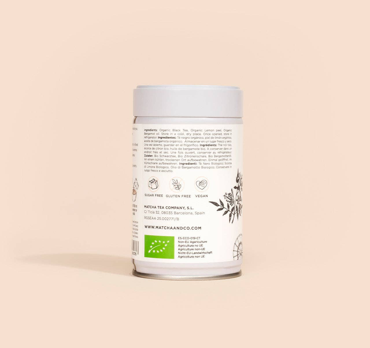 Økologisk svart te, økologisk sitronskall, økologisk bergamotolje. Oppbevares på et kjølig og tørt sted.