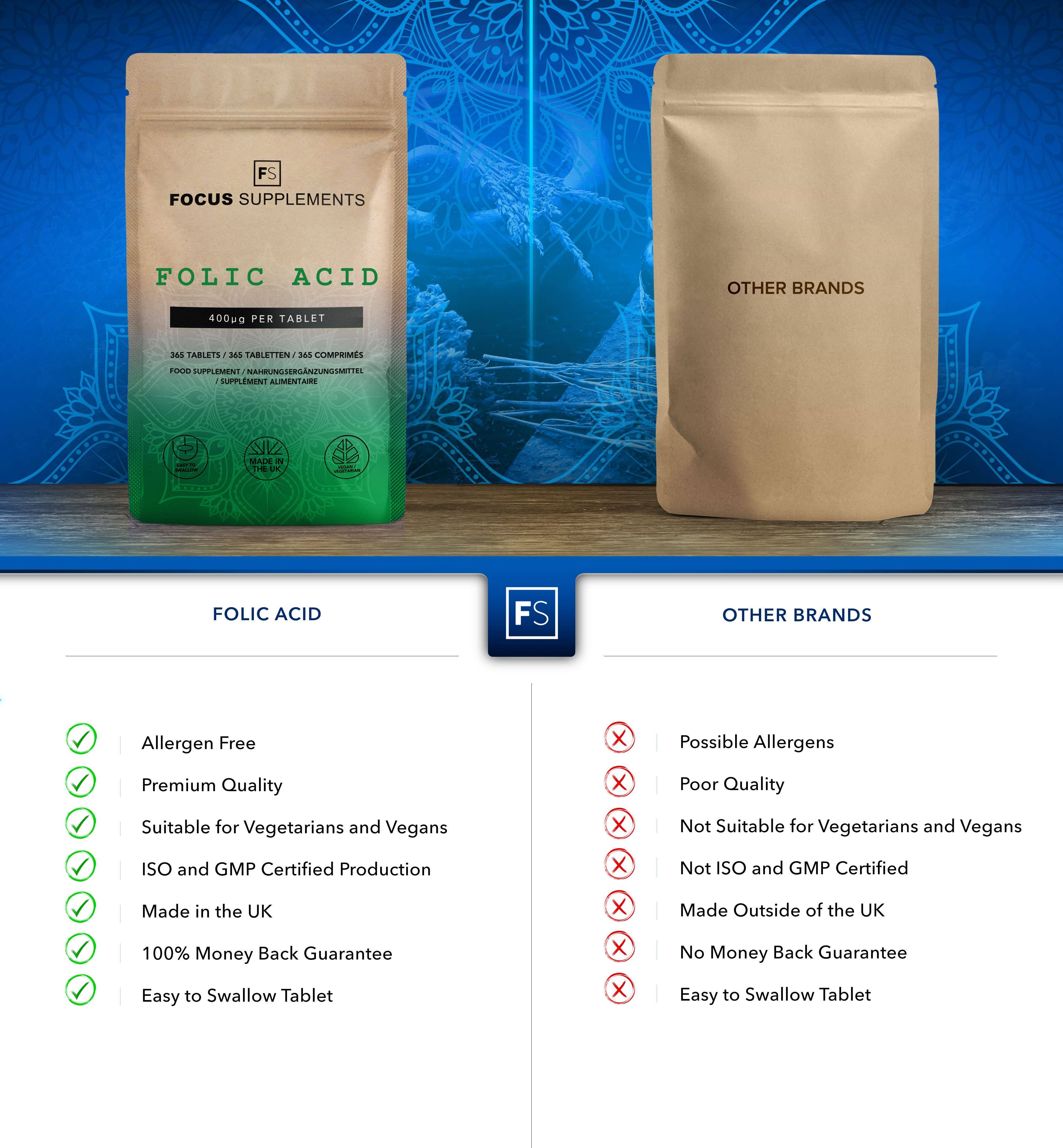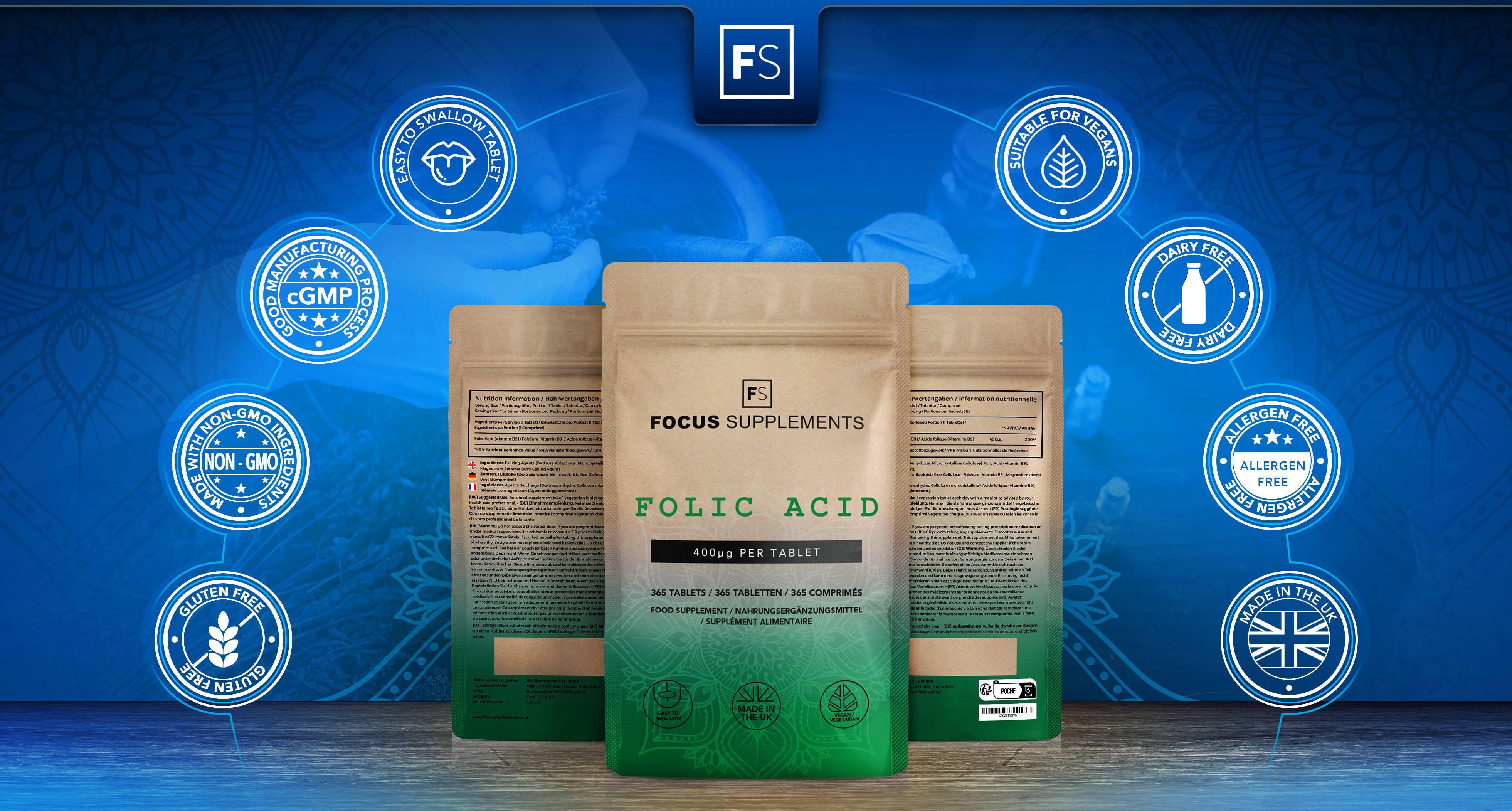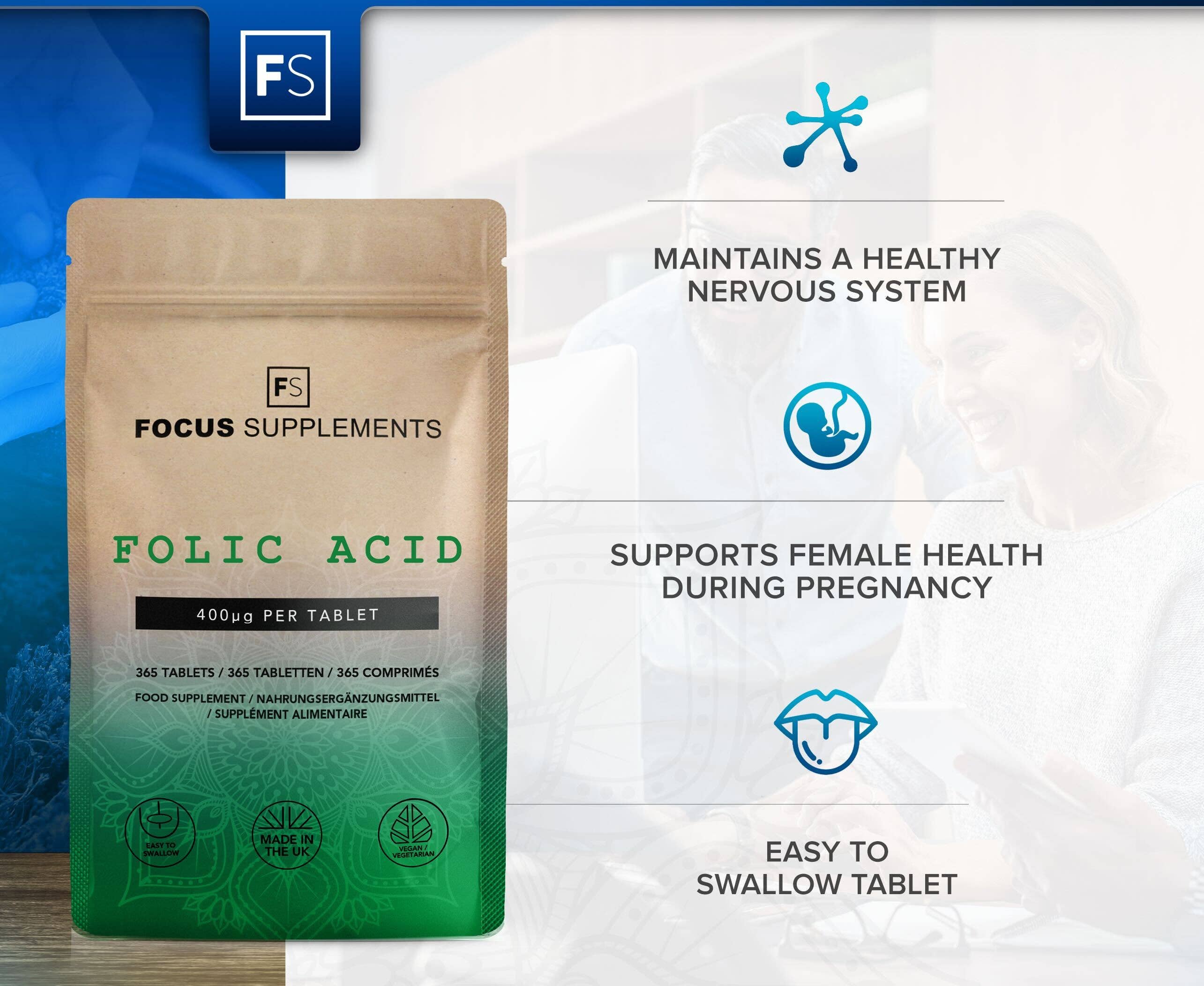 Folsyre 400 µg 365 tabletter. Dette kosttilskuddet fra Focus Supplements inneholder 400 µg folsyre per tablett, et essensielt B-vitamin som er viktig for cellevekst, spesielt under graviditet. Folsyre støtter kroppens evne til å produsere nye celler, styrker immunsystemet og bidrar til normal funksjon av nervesystemet. Dette tilskuddet er ideelt for kvinner som planlegger graviditet eller er gravide, samt for personer som trenger ekstra støtte til hjerte- og hjernehelse.