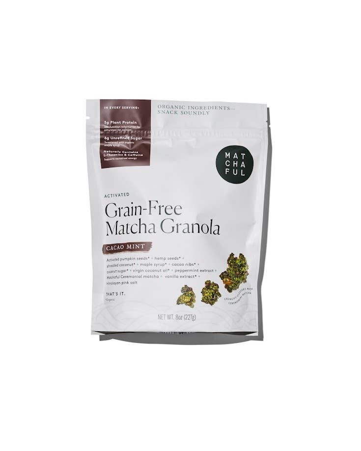 Cacao Mint Activated Granola 226.8g. Denne deilige granolaen fra Matchaful er laget med aktivert matcha og en herlig kombinasjon av kakao og mynte, og veier 8 oz (ca. 226g). Granolaen er perfekt for en sunn og energigivende start på dagen. Aktivert matcha bidrar med naturlige antioksidanter og et energiboost, samtidig som den friske minten gir en forfriskende smak. Granolaen inneholder også næringsrike ingredienser som gir langvarig metthetsfølelse og støtte til et aktivt liv.