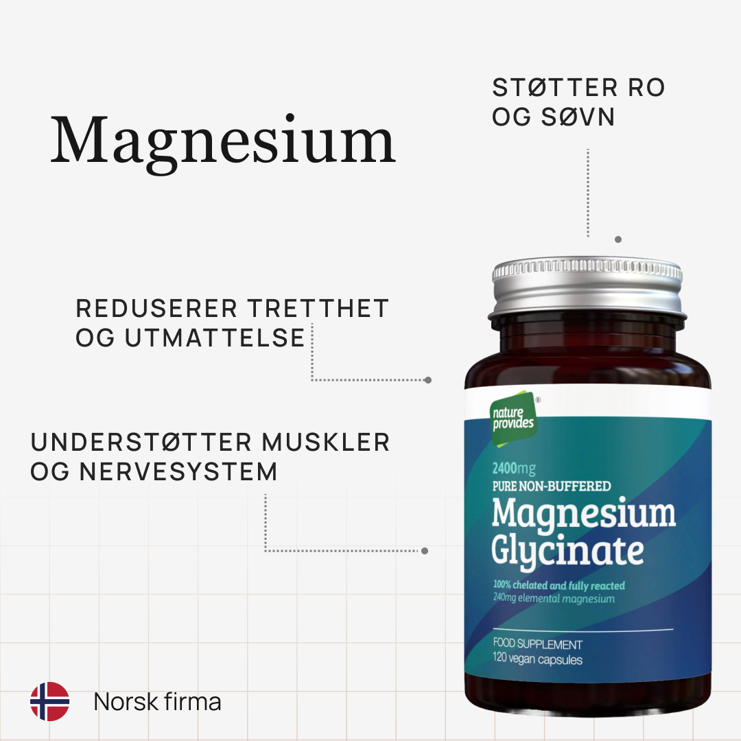 Et skånsomt og lettopptakelig magnesiumtilskudd som bidrar til å redusere tretthet, støtte nervesystemet og fremme bedre søvnkvalitet. Glysinbundet magnesium er kjent for sin høye biotilgjengelighet og milde effekt på fordøyelsen, og kan gi deg mer ro, overskudd og muskelavslapning – spesielt viktig etter ferier med lite rutiner.