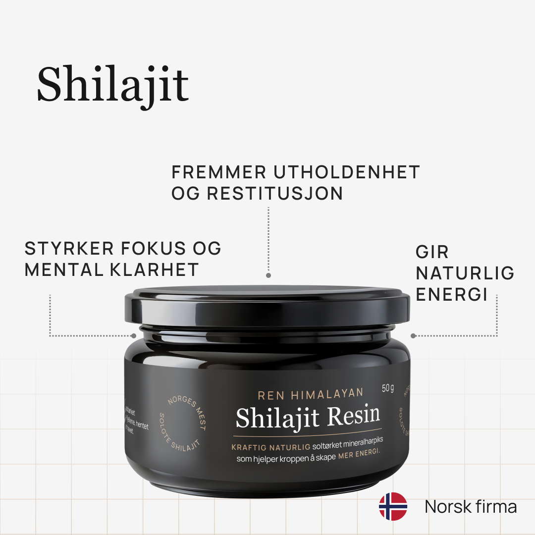 En naturlig superbooster fra Himalaya som gir kroppen essensielle mineraler og fulvinsyre for bedre energinivå, mental fokus og restitusjon. Shilajit er kjent for å styrke vitalitet og utholdenhet, og kan hjelpe deg med å takle stress og komme raskere tilbake til en balansert og energisk hverdag. 100 % ren harpiks – rett fra naturen.