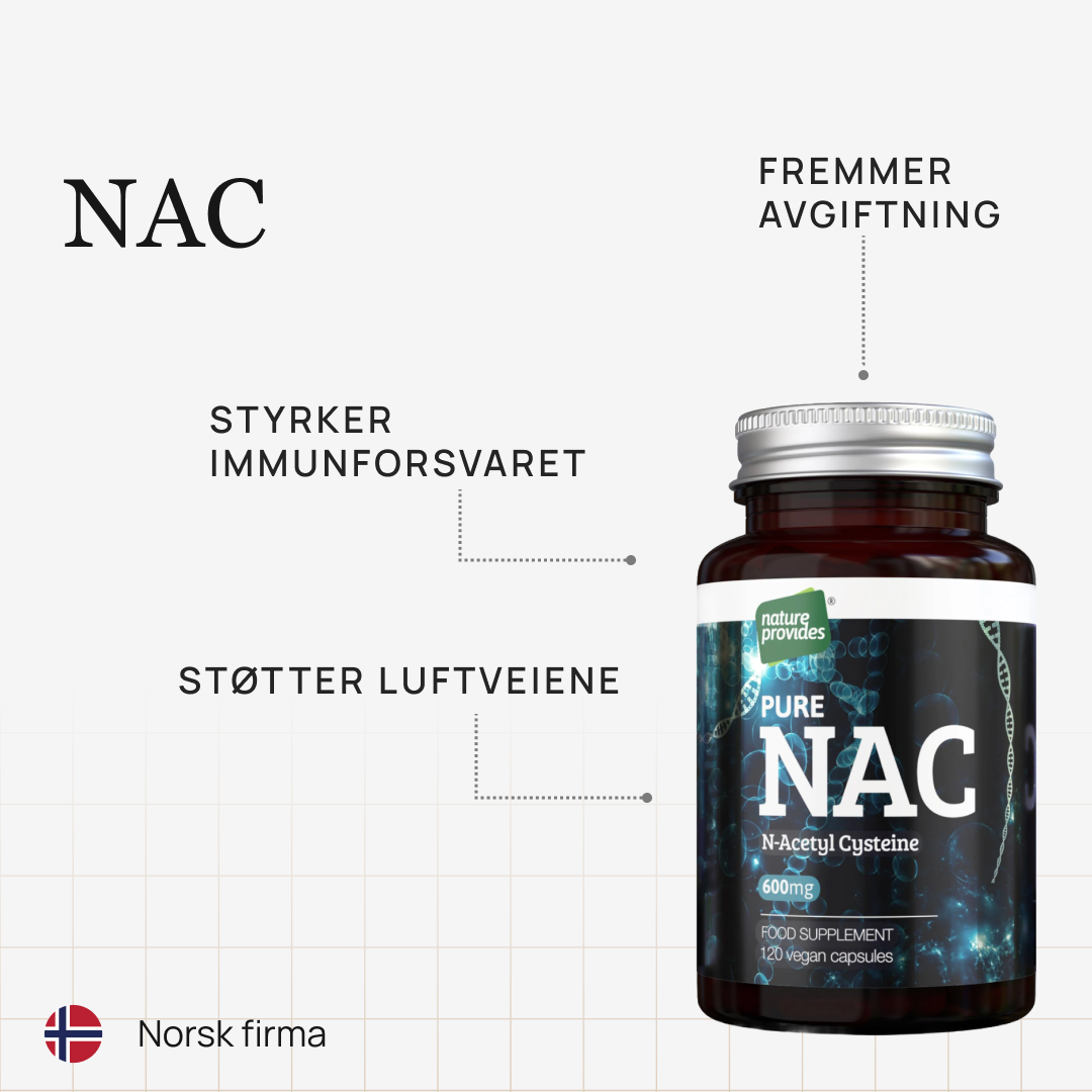 Et kraftfullt tilskudd som støtter kroppens naturlige avgiftningssystem gjennom økt produksjon av glutation – en av kroppens viktigste antioksidanter. NAC kan hjelpe deg med å rense ut avfallsstoffer, støtte immunforsvaret og forbedre lunge- og leverhelse, slik at du føler deg klarere, lettere og mer balansert.
