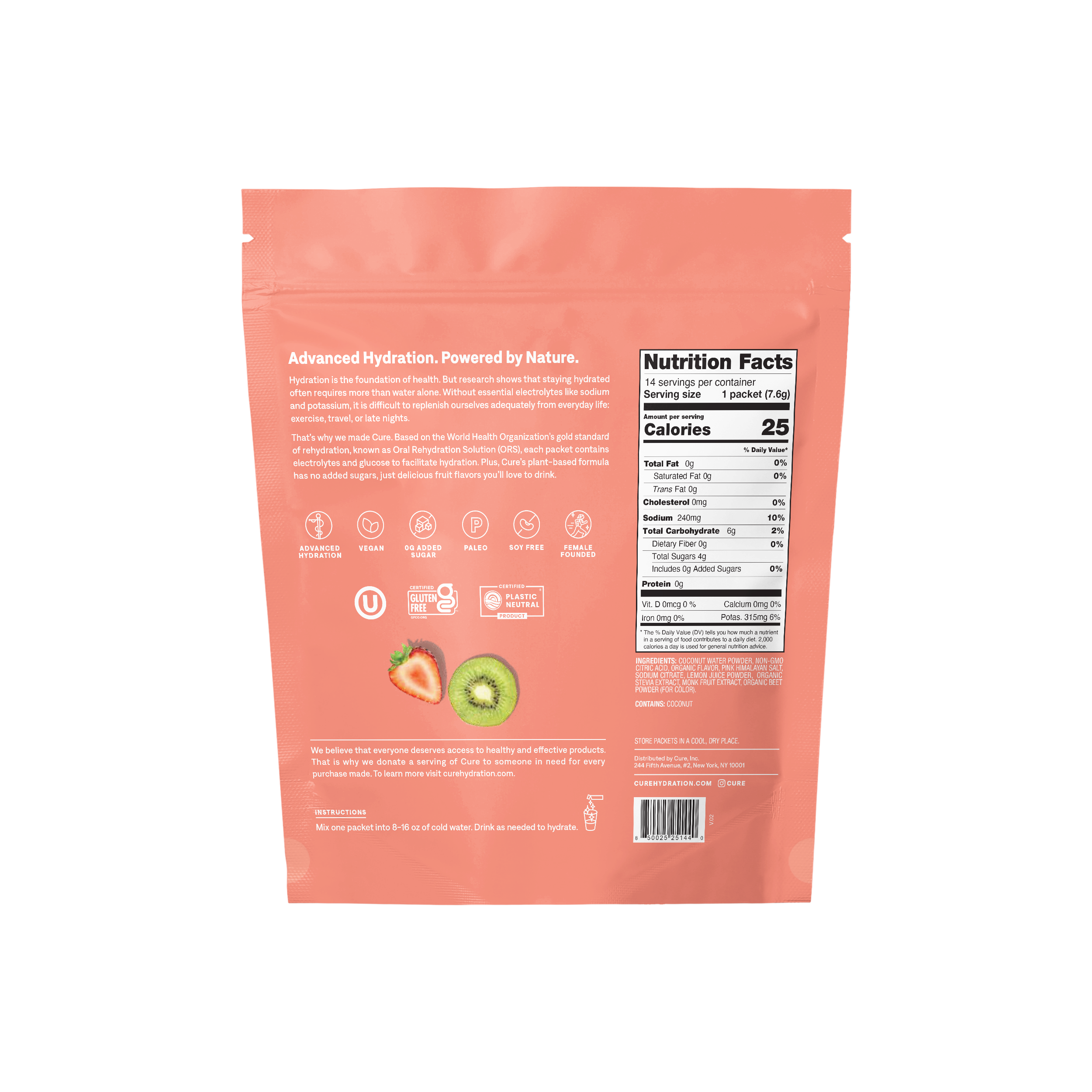 Cure Hydration’s Strawberry Kiwi Elektrolytt Drikkemiks gir den perfekte balansen av hydrering uten tilsatt sukker. Denne elektrolyttdrikken er formulert med kokosnøttvannspulver, rosa Himalayasalt og andre premium plantebaserte ingredienser for å gjenopprette essensielle elektrolytter som natrium og kalium. Den er ideell for alle som ønsker bedre hydrering, og er vegan, non-GMO, og fri for kunstige søtningsmidler og farger, noe som gjør det til en sunn og naturlig måte å holde seg hydrert på hele dagen.