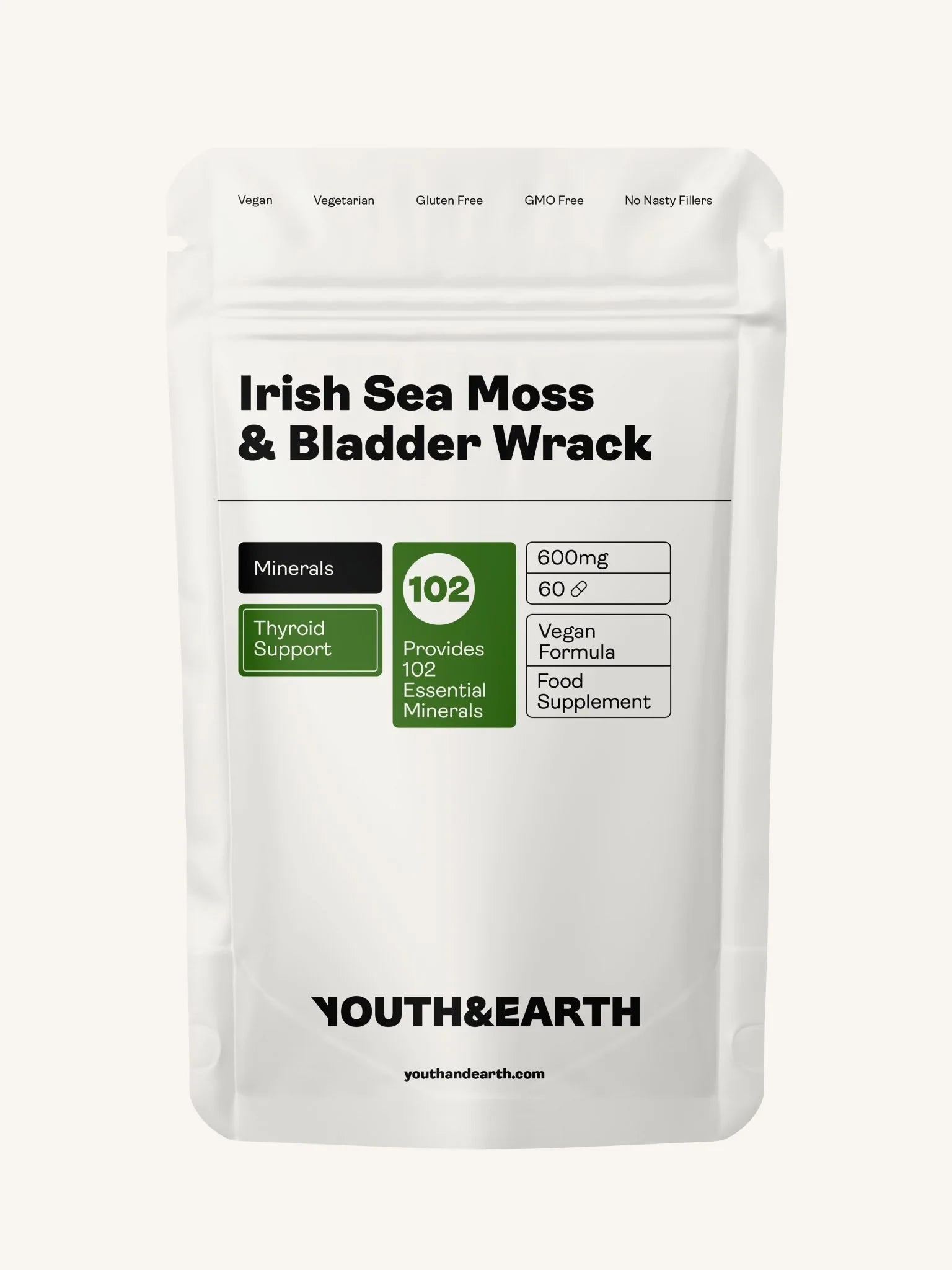 Our Irish Sea Moss & Bladder Wrack supplement are superfood from the sea, that when paired provides you with 102 essential minerals. Both are naturally rich in organically-bound iodine, which provides a more consistent, sustained release of iodine for a healthier thyroid. Irish Sea Moss & Bladder Wrack also contain omega-3 fatty acids for a healthy heart and antioxidants and fibre for a healthy gut. Additionally, they boost energy levels as low iron and iodine levels can cause extreme fatigue and weaken your immune system. Irish Sea Moss & Bladder Wrack may also help weight control and contribute to your eye health. Irish Sea Moss is a type of red algae that grows in tidepools and rocky coasts and contains an amazing 92 minerals. Bladder Wrack is a leathery, brown seaweed found along coasts, high in iodine and antioxidants (phytochemicals such as phlorotannins and fucoxanthin). Both Irish Sea Moss and Bladder Wrack have a long history of herbal medicinal use.