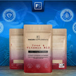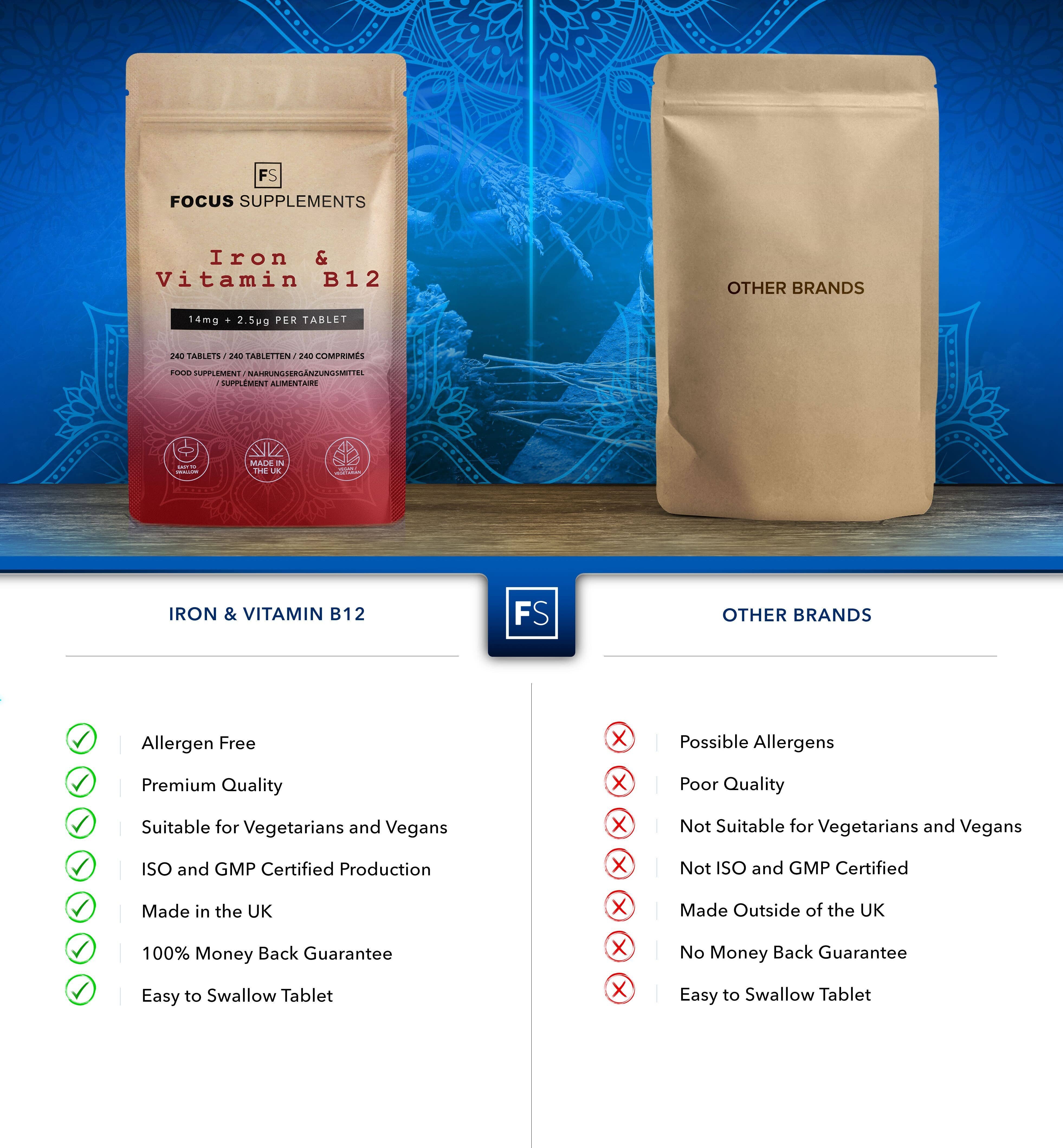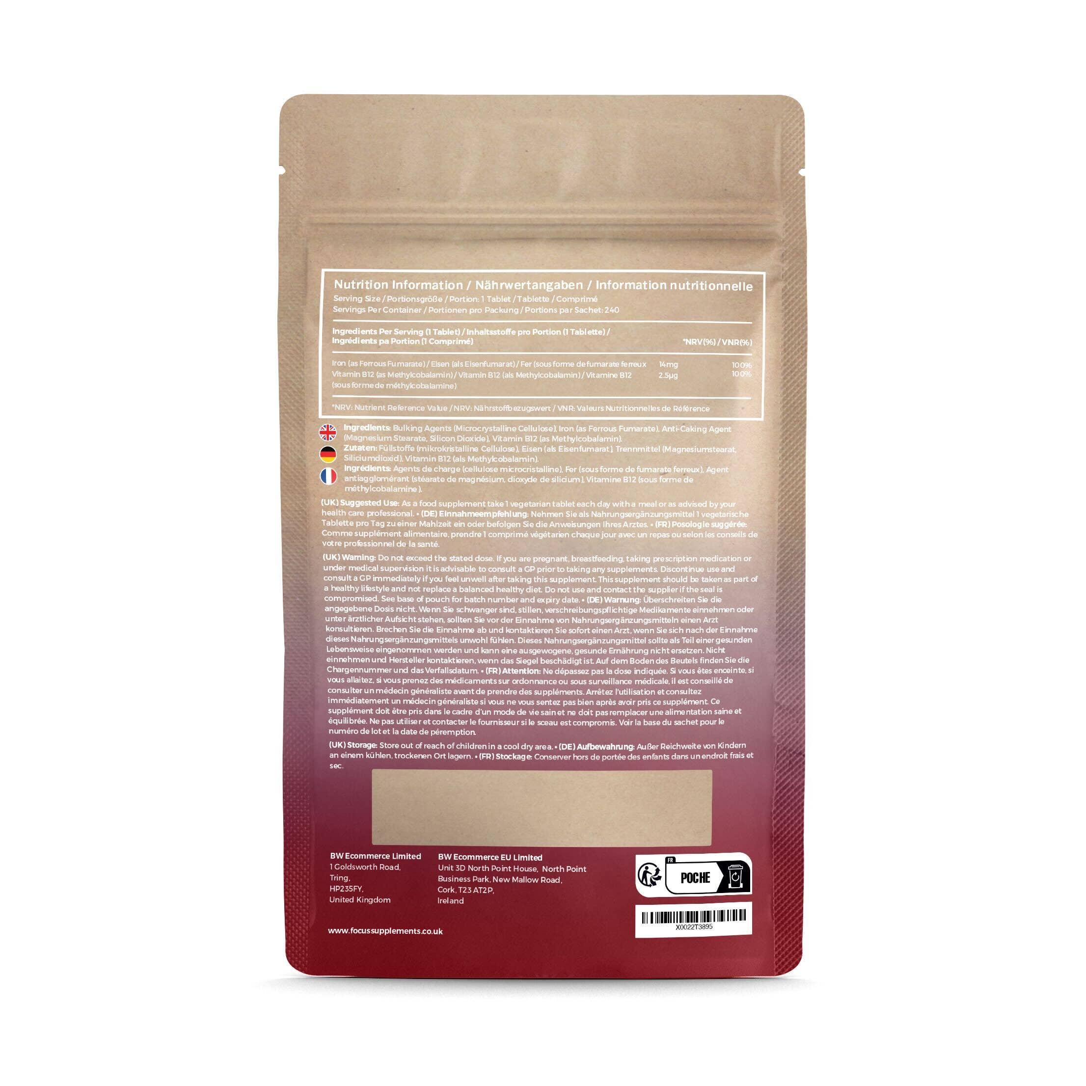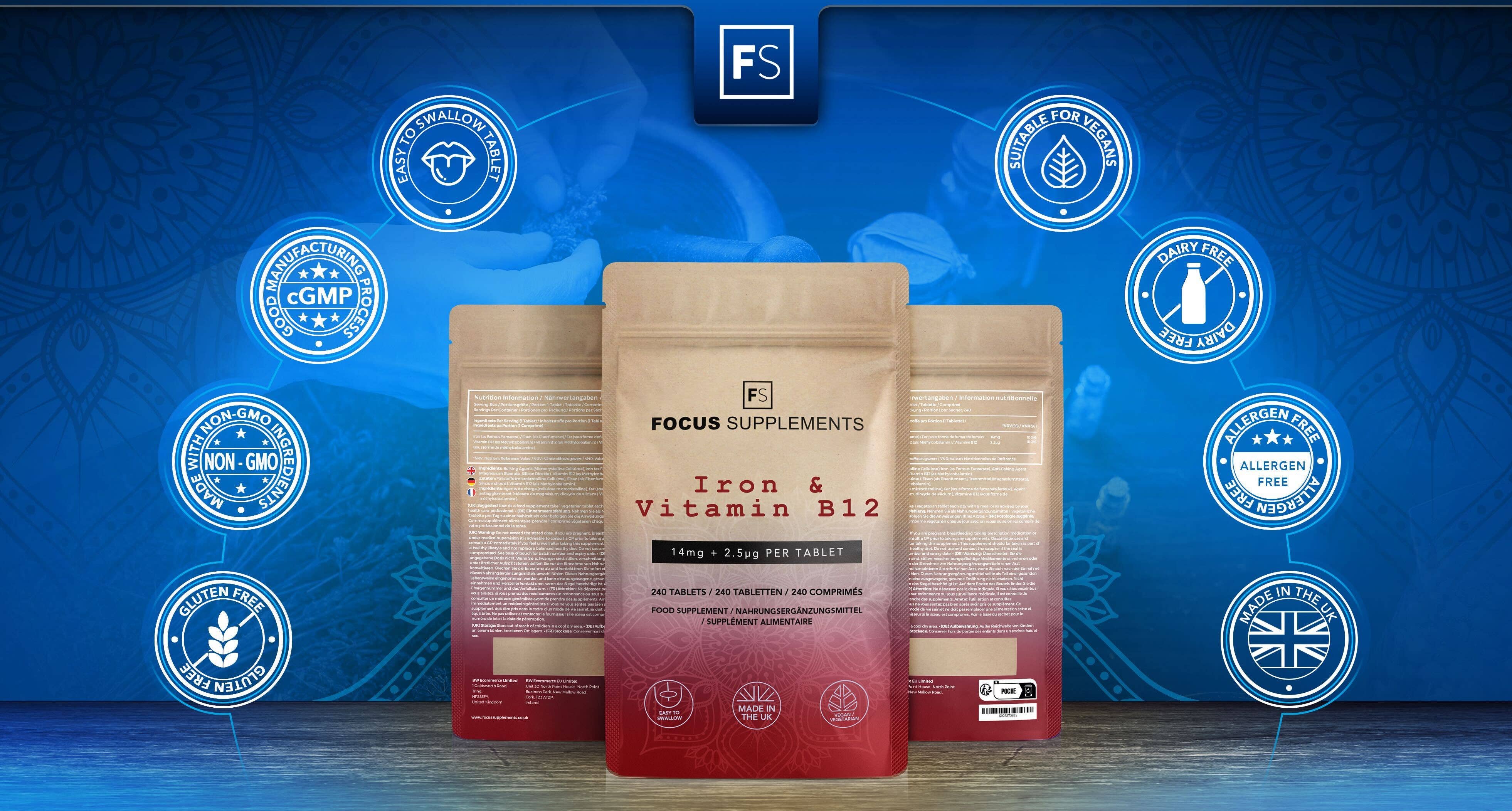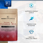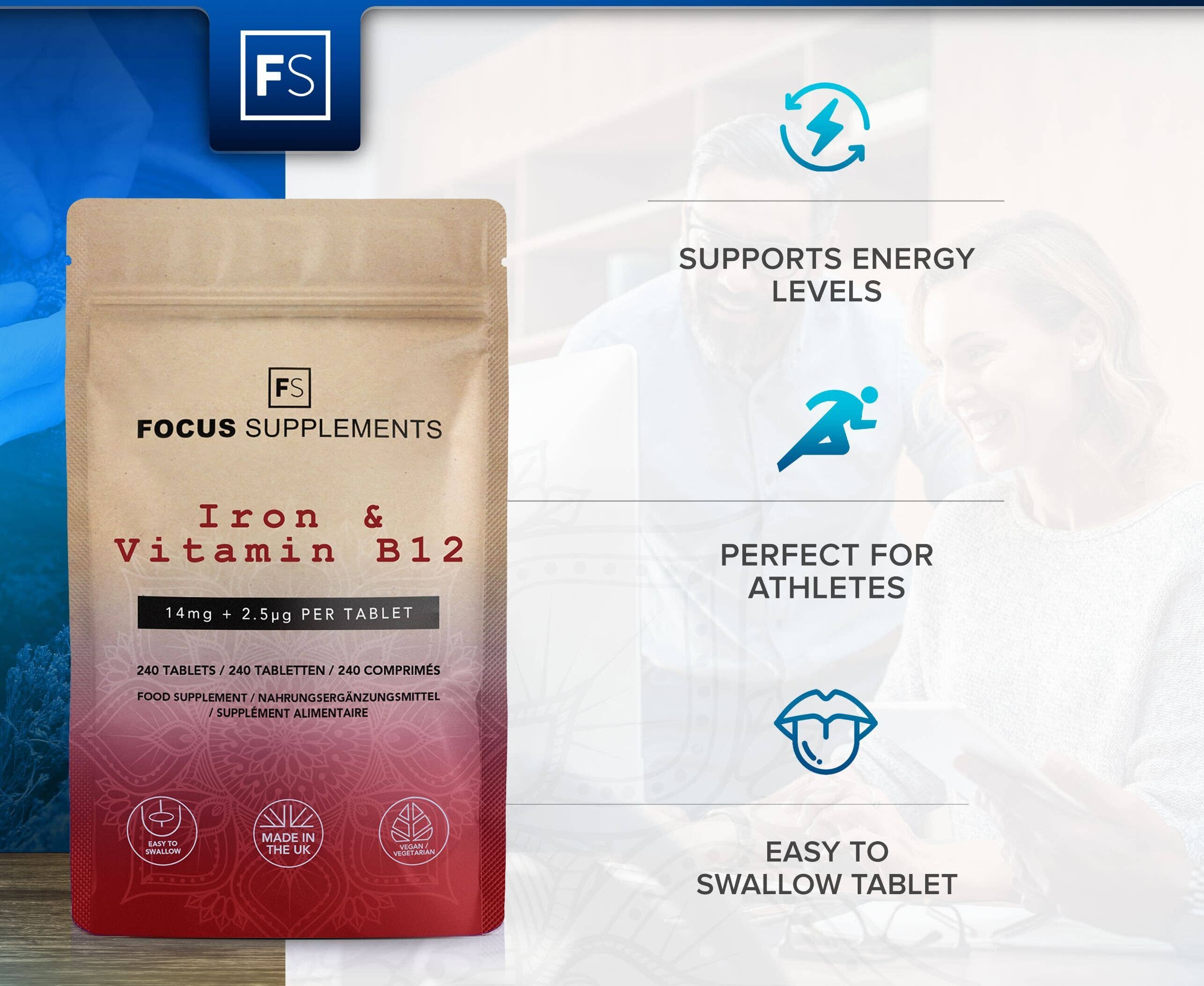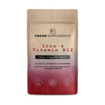 Iron & Vitamin B12 240 tabletter. Dette kosttilskuddet fra Focus Supplements kombinerer 14 mg jern og 2,5 µg vitamin B12 per tablett. Jern er essensielt for produksjon av røde blodceller og kan bidra til å redusere tretthet, mens vitamin B12 støtter nervefunksjon og DNA-produksjon. Produktet er egnet for vegetarianere, veganere, og er fri for allergener, melk og gluten. Det er produsert i Storbritannia og inneholder ingen unødvendige tilsetningsstoffer.