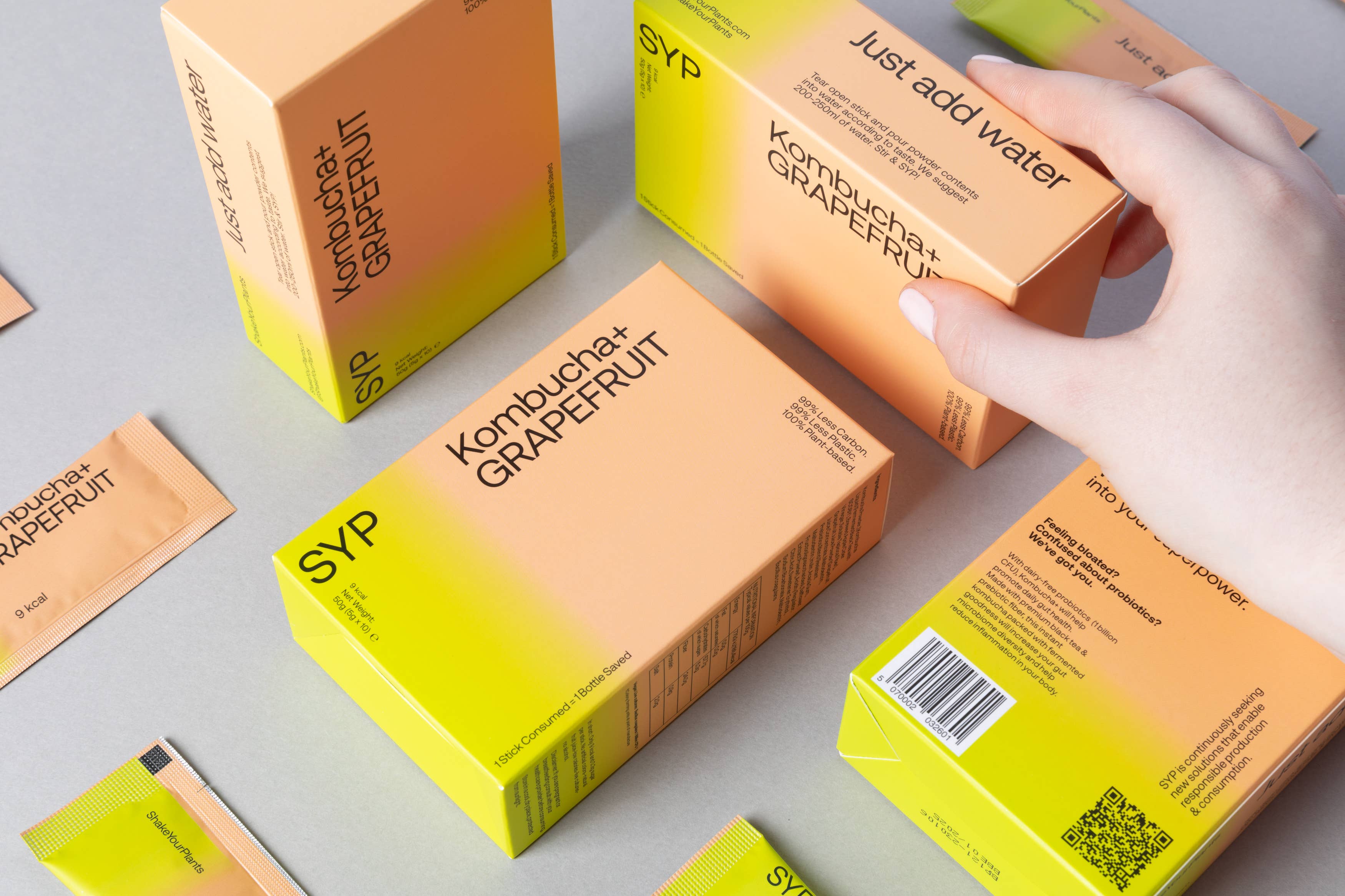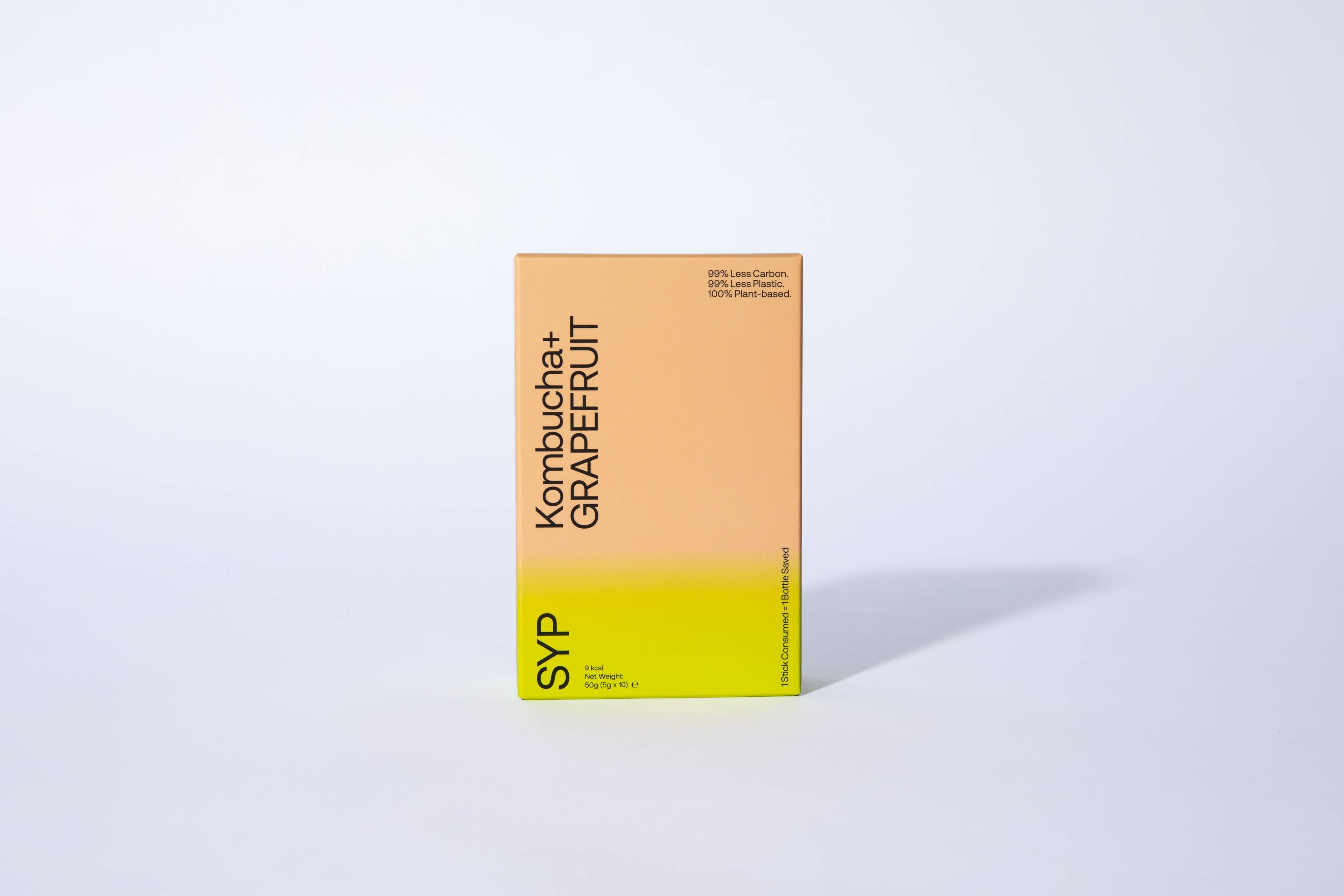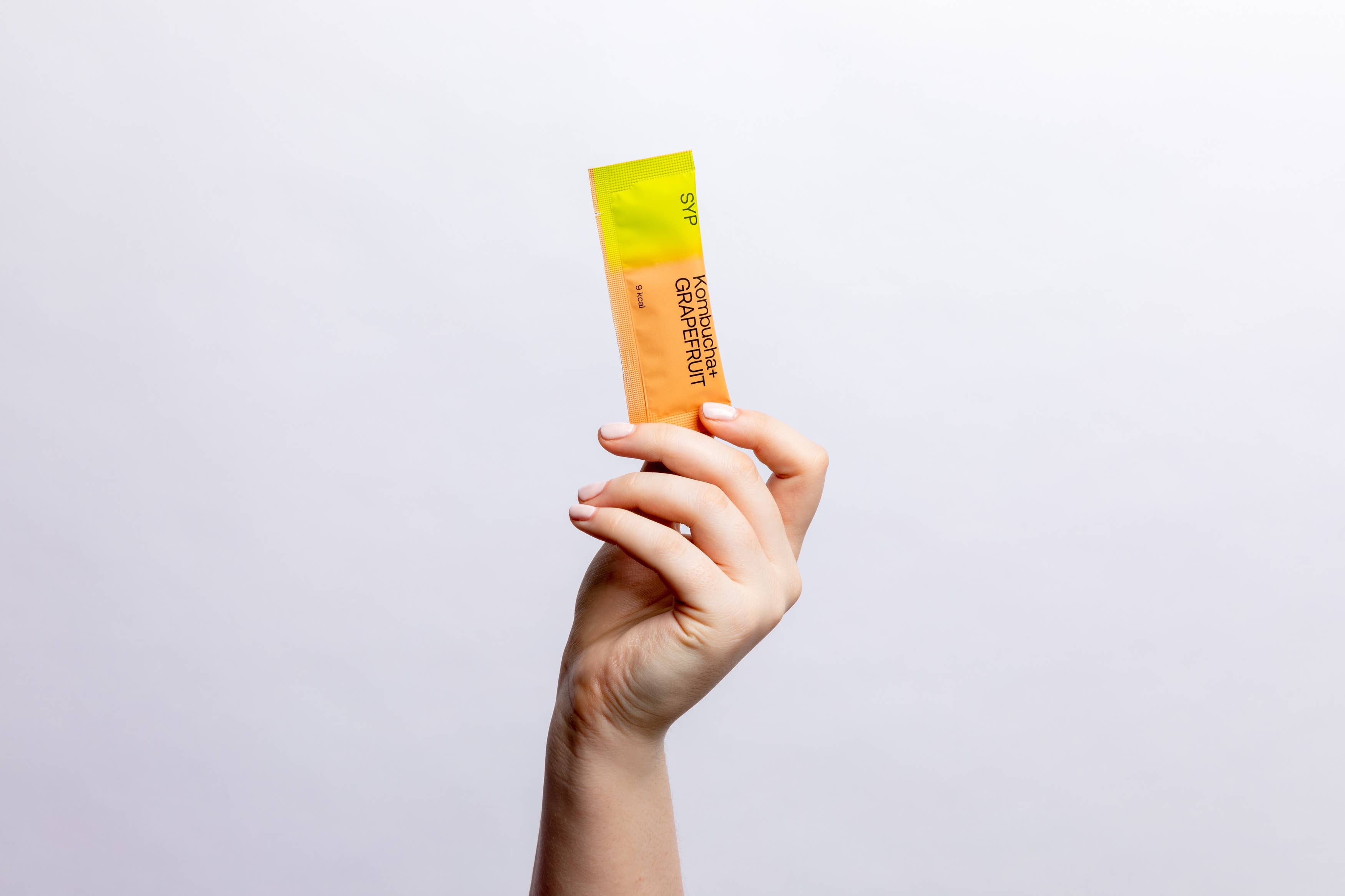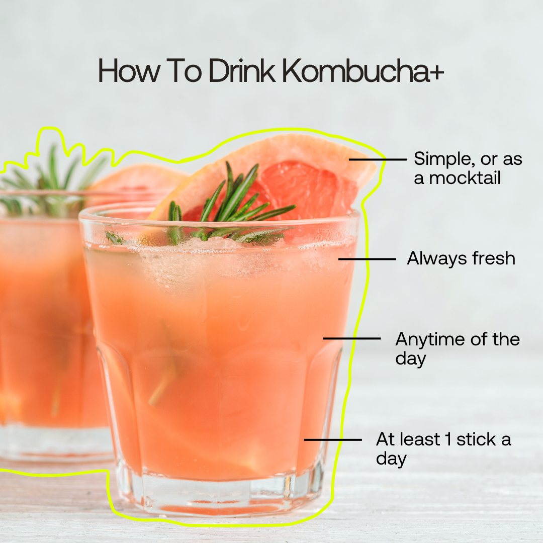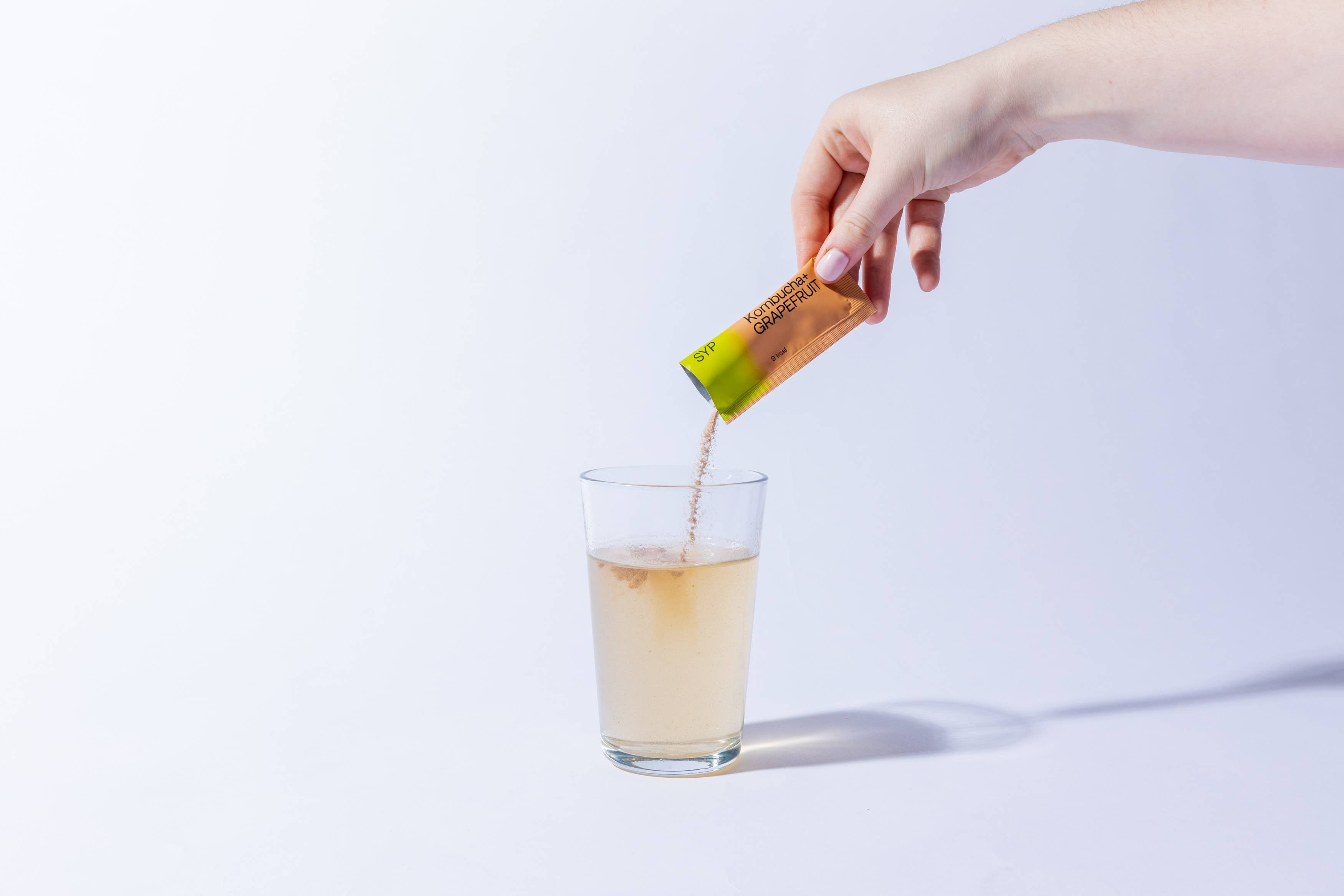 Kombucha-pulver [Kombucha-væske (fermentert svart te med SCOBY), brygget eplecidereddik, løselig tapiokafiber], grapefruktjuicepulver [grapefruktjuicekonsentrat, maltodekstrin, prebiotikablanding (resistent maltodekstrin, inulin, akasiegummi, frukto-oligosakkarider), saflorekstraktpulver], surhetsregulerende middel: Sitronsyre, søtningsmiddel: Erytritol, natriumbikarbonat, maltodekstrin, Bacillus coagulans.