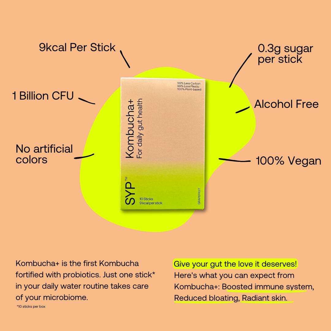 Kombucha+ er mer enn bare en probiotisk drikk – det gir en kombinasjon av fordelene fra kombucha-te, grapefruktens vitamin C og fiber, og en rekke andre helsefordeler som støtter en sunn tarmflora og bedre næringsopptak. Probiotikaen i kombucha+ kan bidra til å balansere mikrofloraen i tarmen, støtte fordøyelsen og hjelpe med å opprettholde et sterkt immunforsvar. Dette gjør den til et ideelt tillegg til din daglige helse-rutine, spesielt for personer som ønsker å forbedre sin tarmhelse eller redusere betennelse i kroppen.