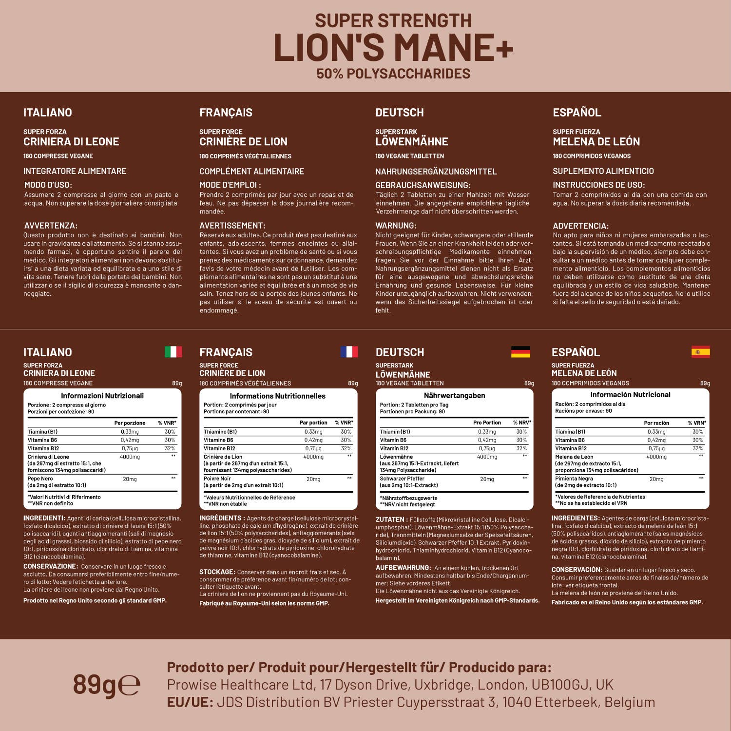 Fyllstoffer (mikrokrystallinsk cellulose, dikalsiumfosfat), løvemanke 15:1-ekstrakt (50 % polysakkarider), antiklumpemiddel (magnesiumstearat, silisiumdioksid), svart pepper 10:1-ekstrakt, pyridoksinhydroklorid (vitamin B6), tiaminhydroklorid (vitamin B1), vitamin B12 (cyanokobalamin).