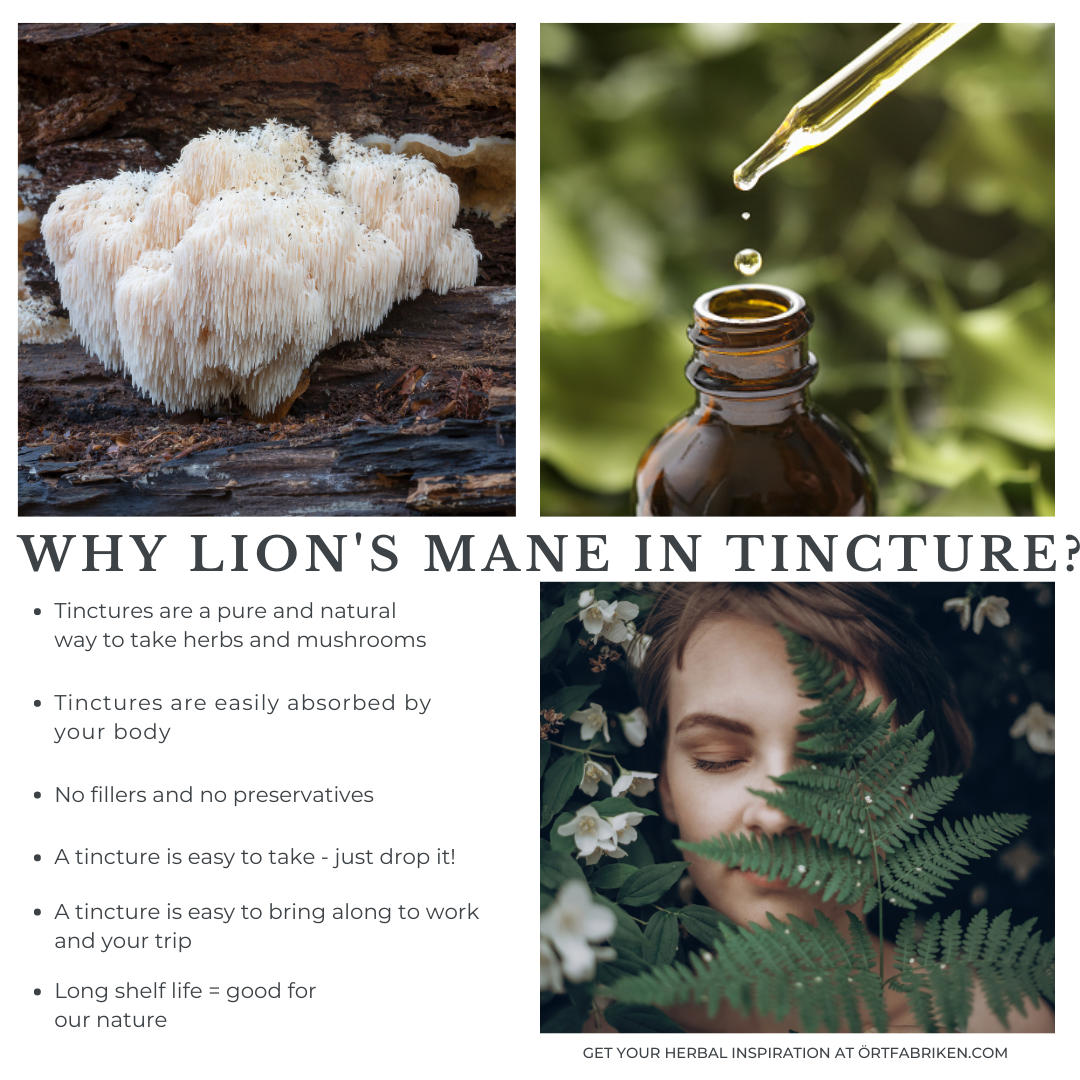 Lion's Mane Tinktur 50 ml fra Örtfabriken er laget av Hericium erinaceus (løveklovensopp), som er kjent for sine potensielle kognitive fordeler. Den er laget med en dobbelt ekstraksjonsprosess som sikrer at de aktive ingrediensene, som betaglukaner og antioksidanter, blir bevart. Den inneholder kun svampens kropp og ingen mycelium eller fyllstoffer, noe som gir et rent og kraftig ekstrakt.