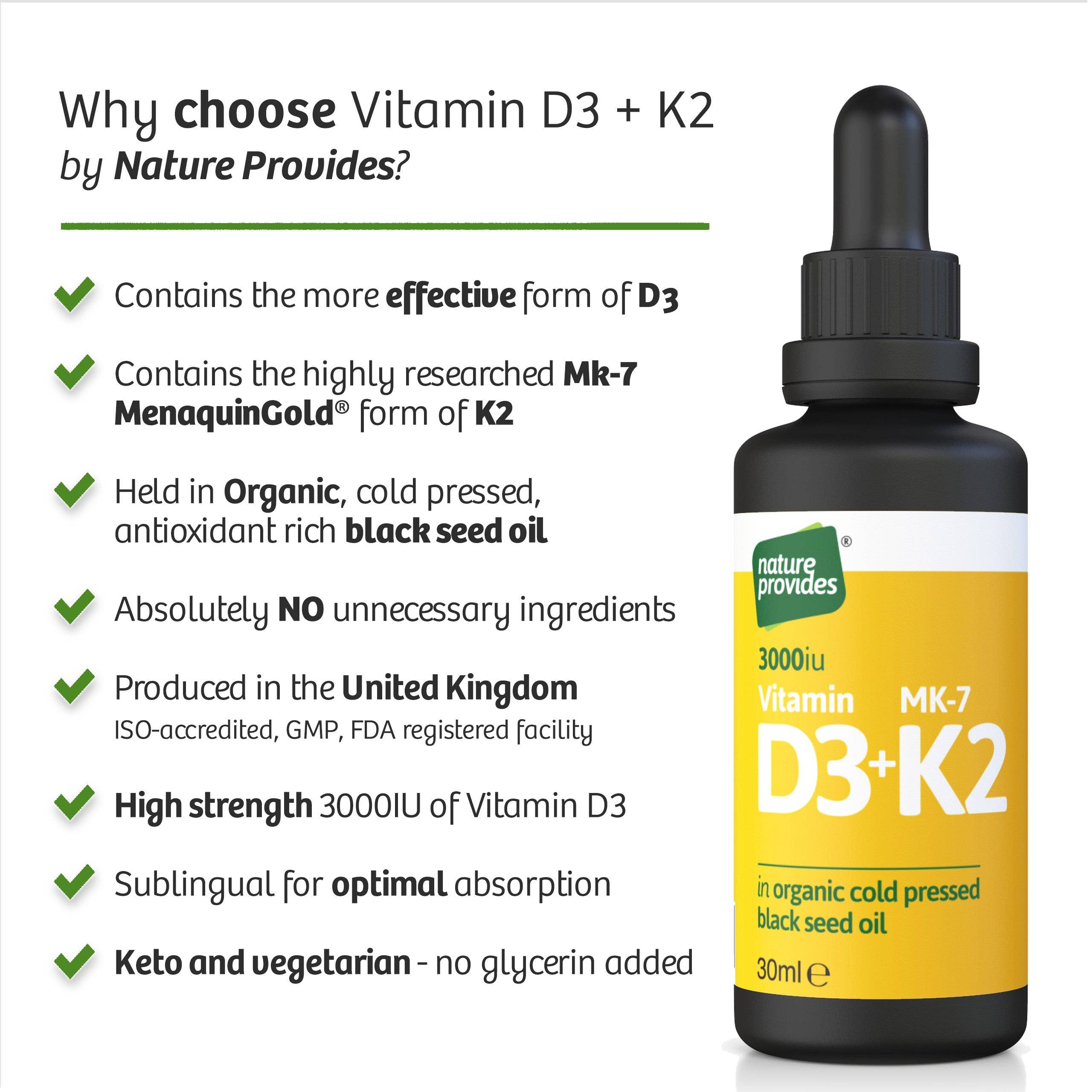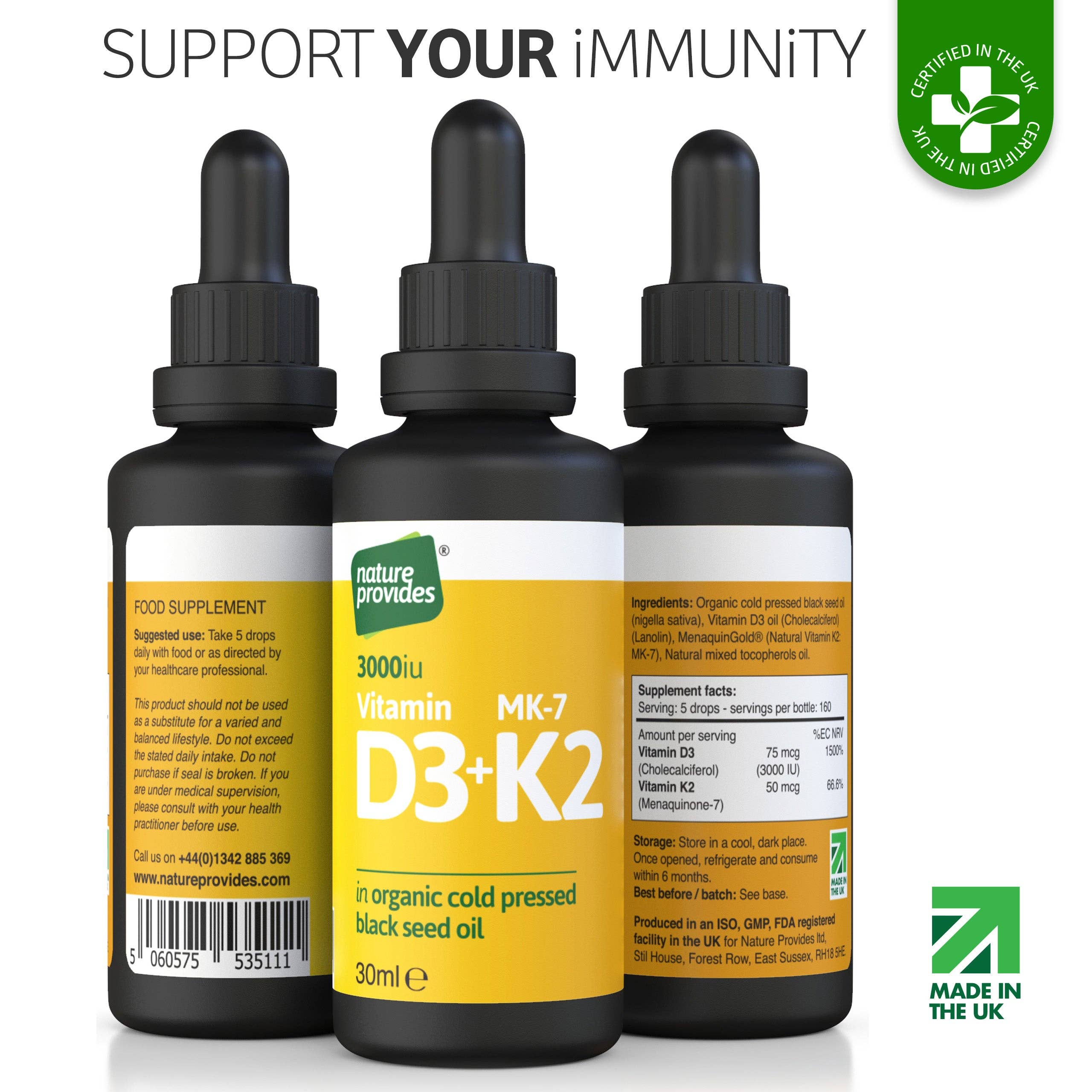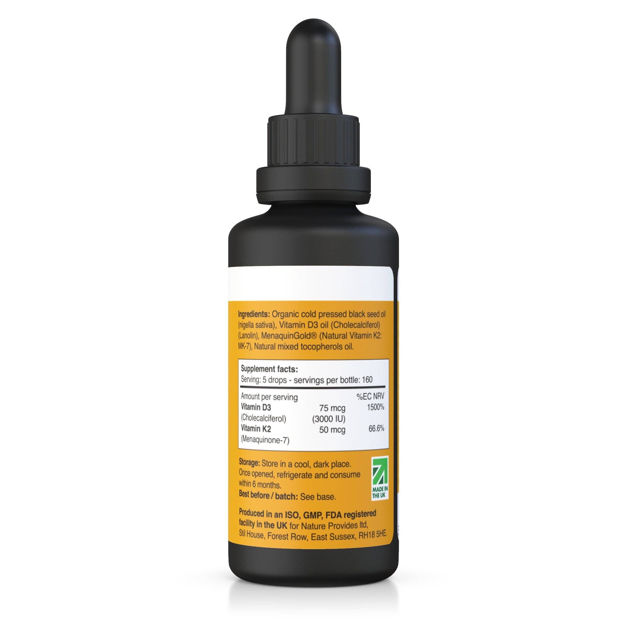 Hver porsjon på 5 dråper inneholder 75 mcg (3000 IE) vitamin D3 (cholecalciferol) og 50 mcg vitamin K2 (menaquinon-7, 100 % trans-form). Vitamin D3 kan støtte immunforsvaret, fremme kalsiumopptak for sterke bein og tenner, og bidra til normal muskelfunksjon. Vitamin K2 kan samarbeide med vitamin D3 for å sikre at kalsium deponeres i beinene og ikke i blodårene, noe som støtter kardiovaskulær helse. Svartfrøolje er kjent for sine antioksidantegenskaper og kan gi ytterligere støtte til immunforsvaret.