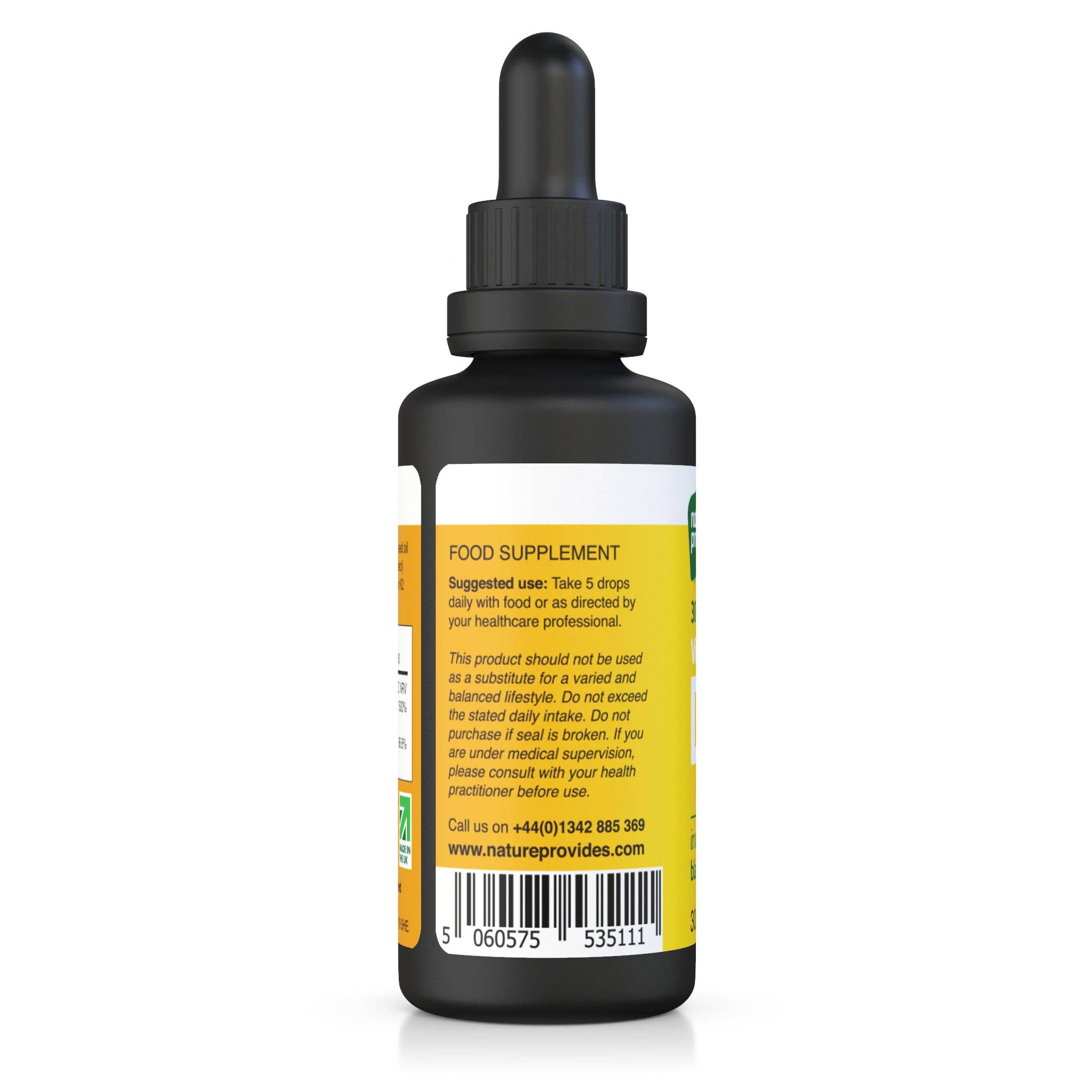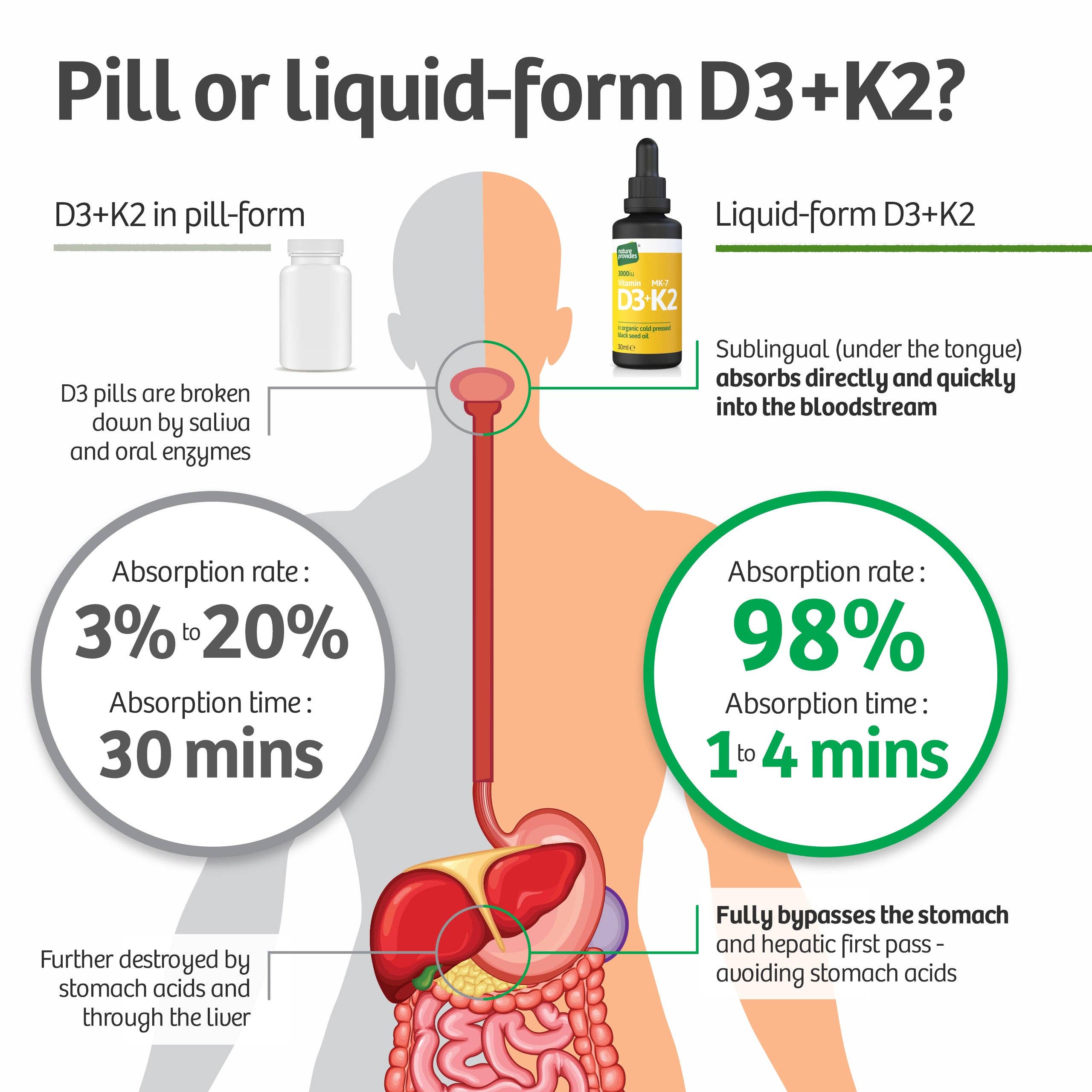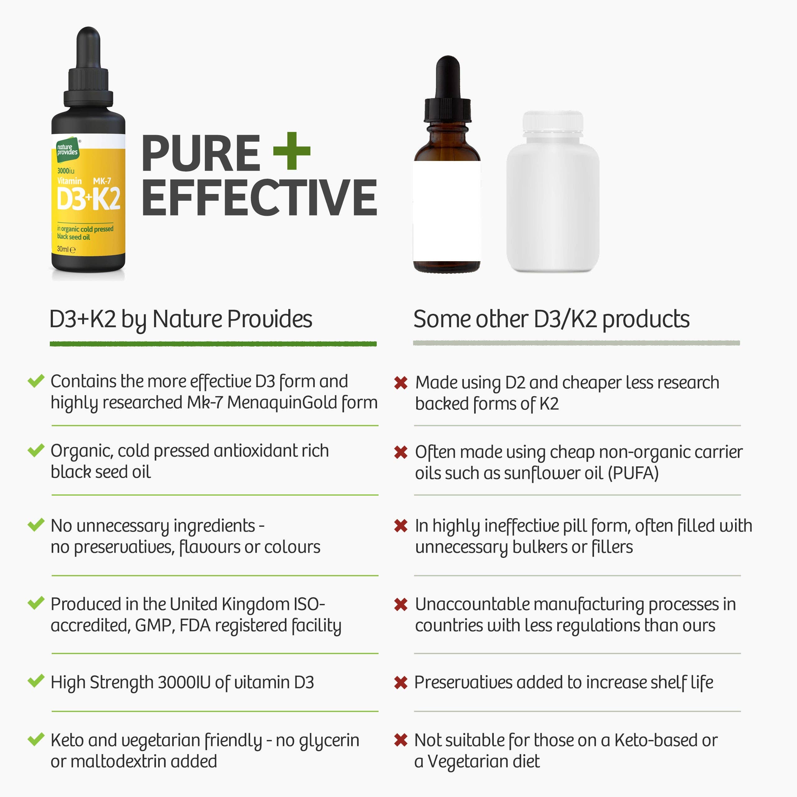 Hver porsjon på 5 dråper inneholder 75 mcg (3000 IE) vitamin D3 (cholecalciferol) og 50 mcg vitamin K2 (menaquinon-7, 100 % trans-form). Vitamin D3 kan støtte immunforsvaret, fremme kalsiumopptak for sterke bein og tenner, og bidra til normal muskelfunksjon. Vitamin K2 kan samarbeide med vitamin D3 for å sikre at kalsium deponeres i beinene og ikke i blodårene, noe som støtter kardiovaskulær helse. Svartfrøolje er kjent for sine antioksidantegenskaper og kan gi ytterligere støtte til immunforsvaret.