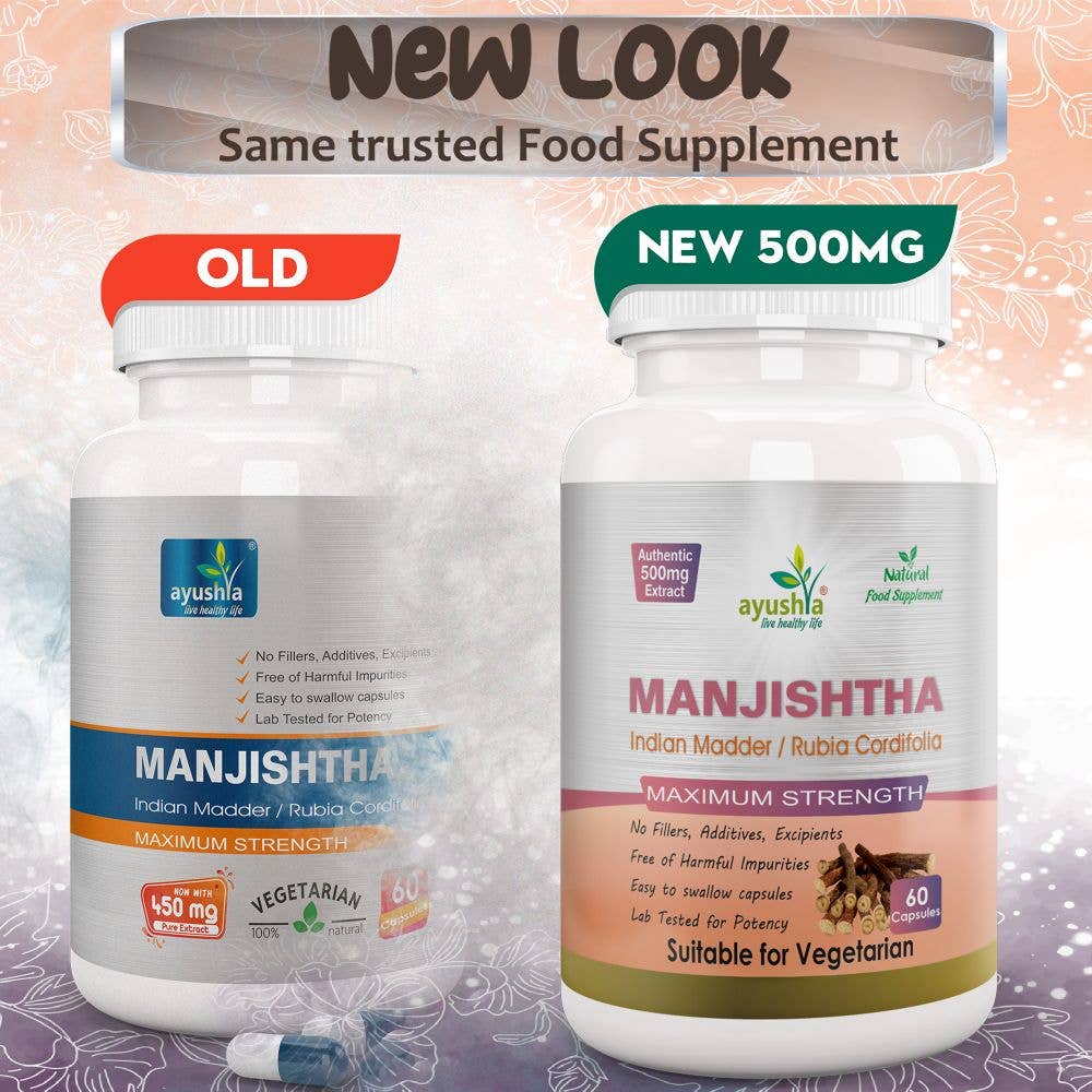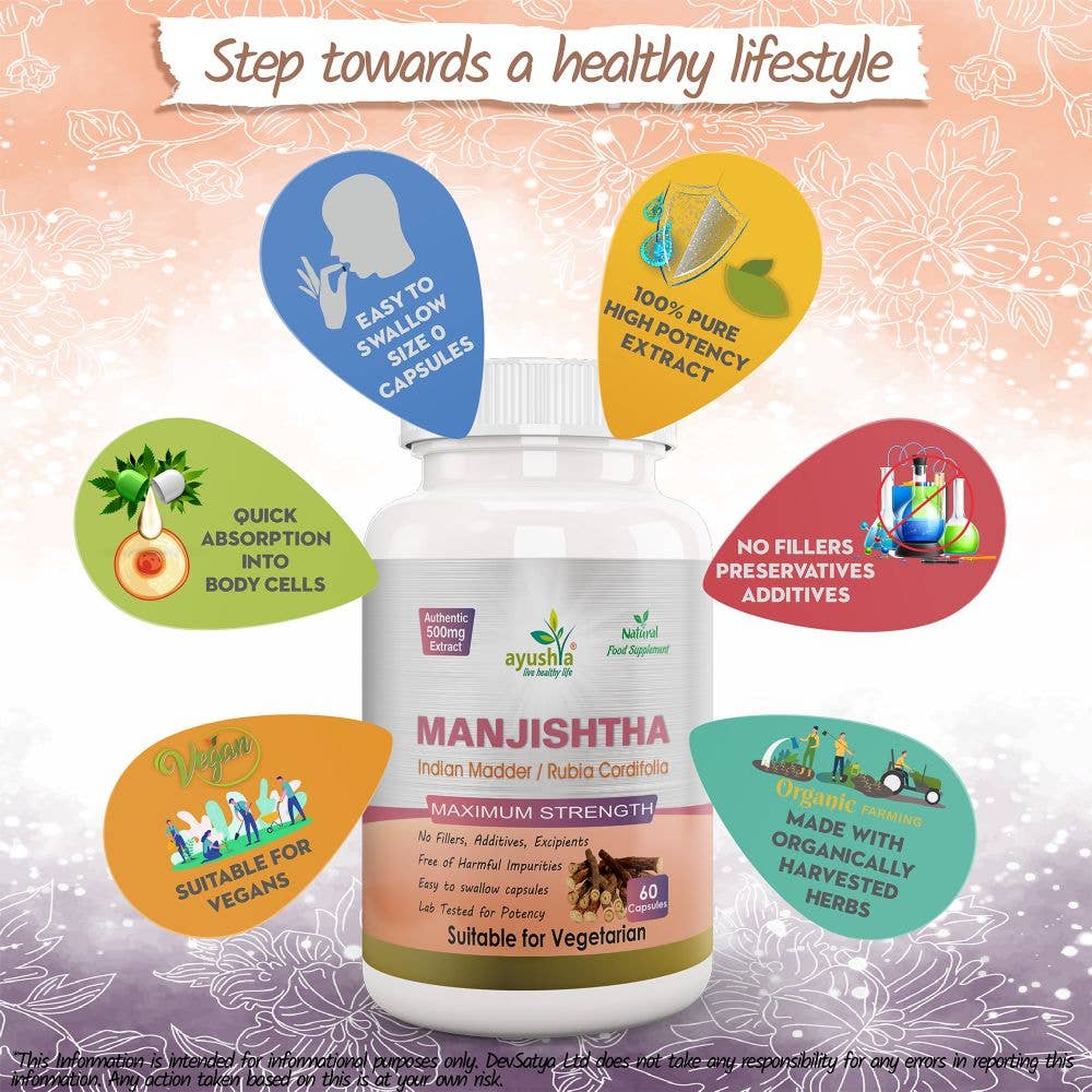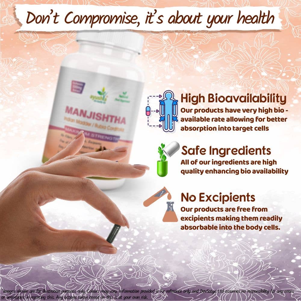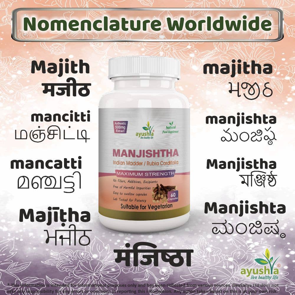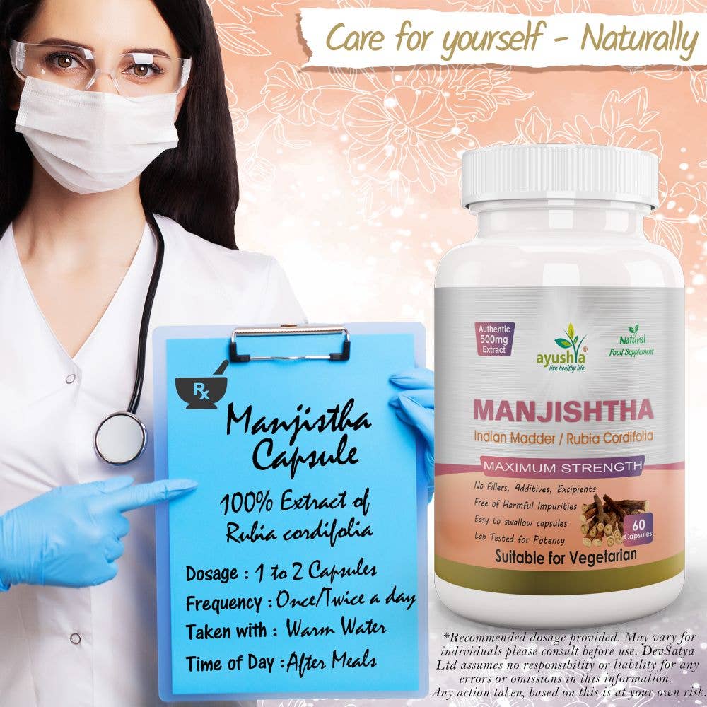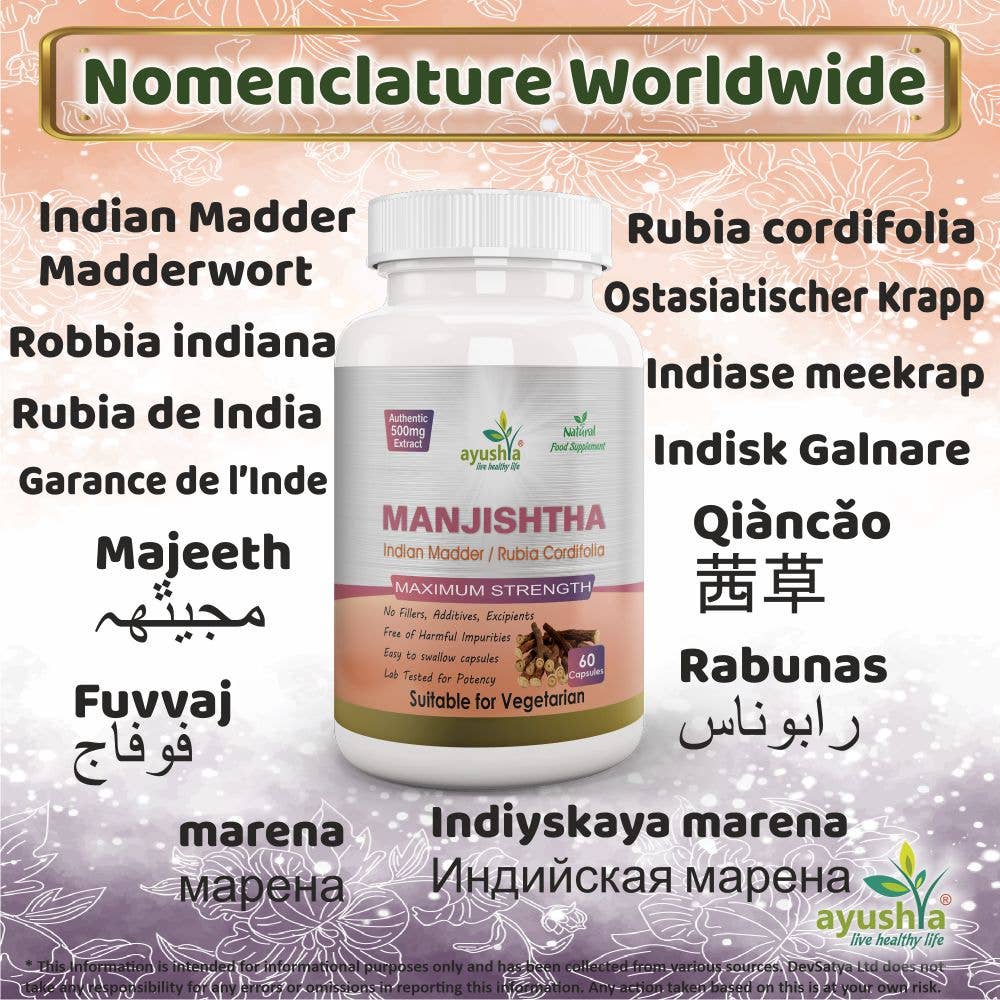 Manjishtha (Rubia cordifolia) ekstrakt – 500 mg per kapsel.