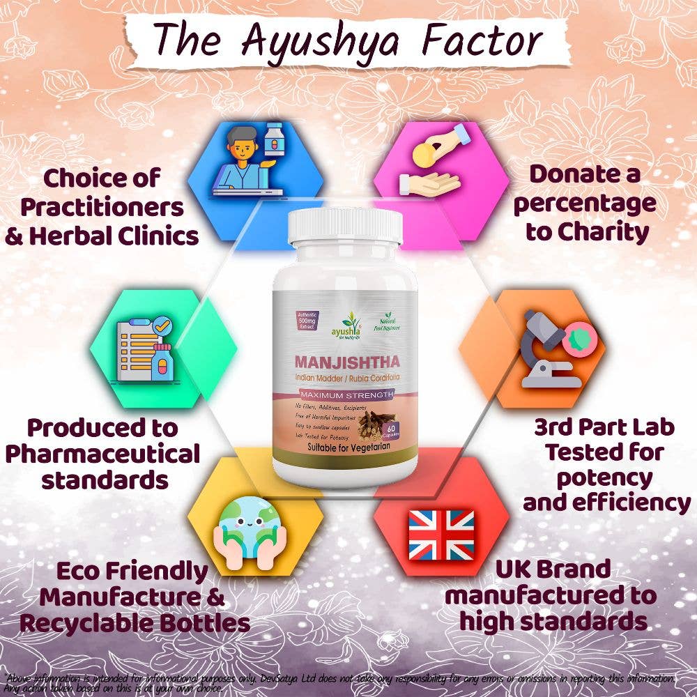 Renser blodet – Manjishtha kan bidra til å eliminere giftstoffer og urenheter fra blodet, noe som kan gi økt energi, forbedret hudhelse og et mer velfungerende immunsystem. Ved å støtte kroppens naturlige renseprosesser, kan den bidra til å redusere opphopning av avfallsstoffer i kroppen, noe som kan være en av årsakene til hudproblemer, tretthet og inflammasjon. Dette gjør urten til en populær ingrediens i ayurvediske detox-protokoller, hvor den ofte brukes for å fremme en frisk og balansert kroppstilstand.