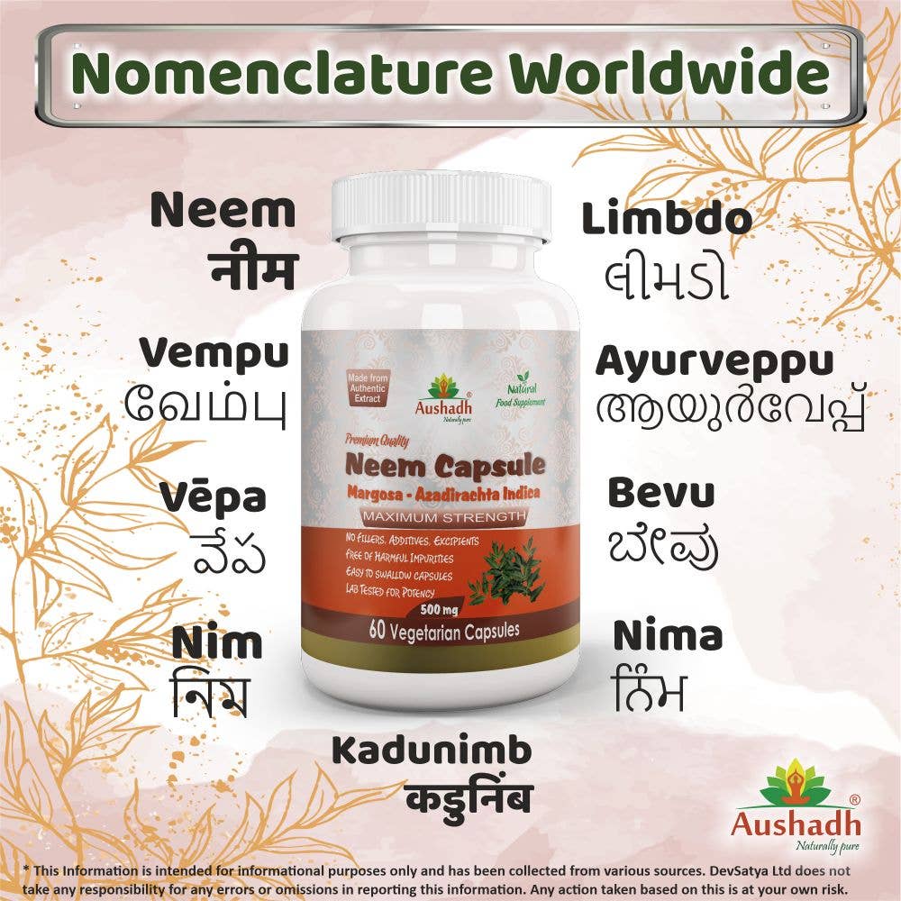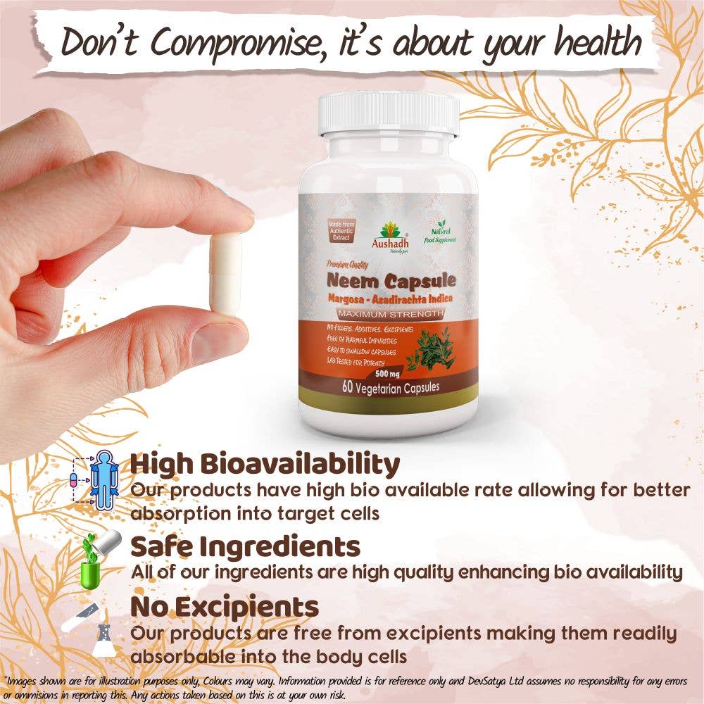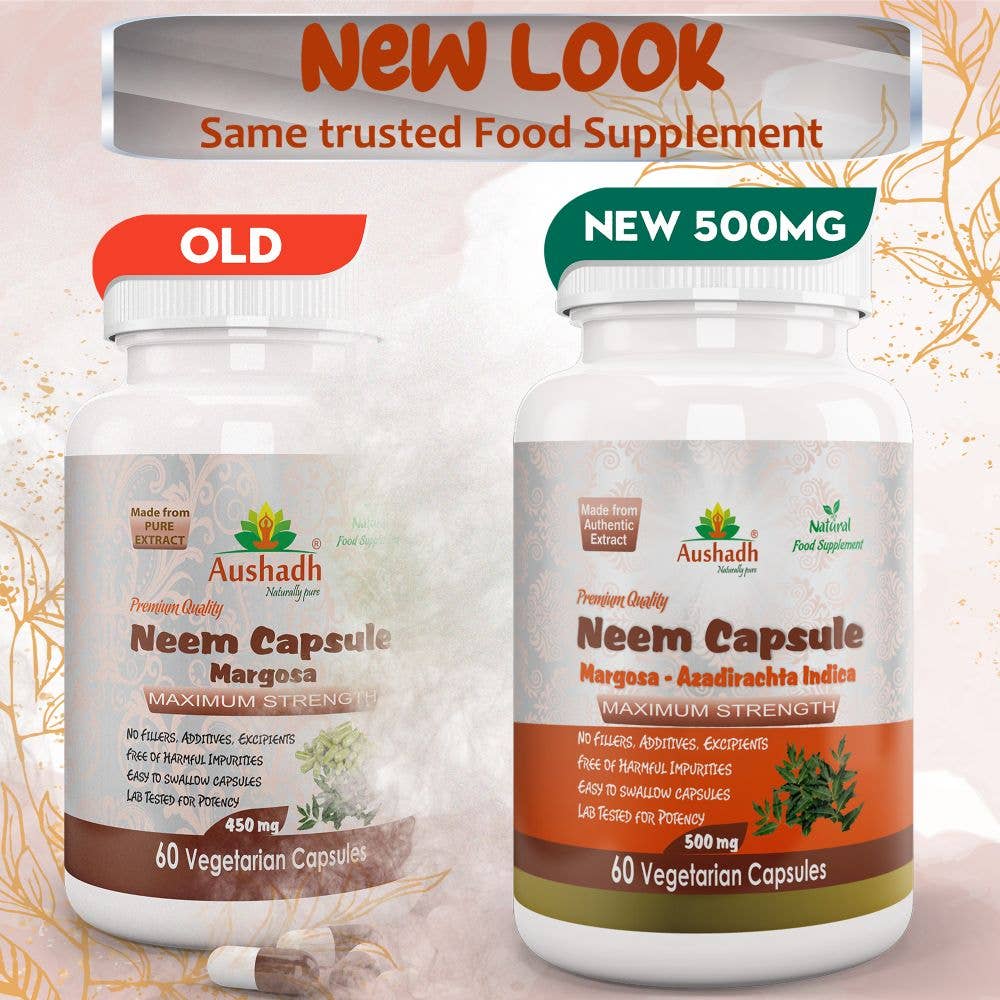 eem (Margosa) Kapsler fra Aushadh inneholder et høykonsentrert ekstrakt av neem (Azadirachta indica), en tradisjonell ayurvedisk urt kjent for sine kraftige antibakterielle og immunstyrkende egenskaper. Dette tilskuddet er spesielt formulert for å støtte hudens helse, fremme kroppens avgiftningsprosesser og bidra til en balansert fordøyelse. Neem er en naturlig blodrenser og kan bidra til å beskytte kroppen mot skadelige mikroorganismer.