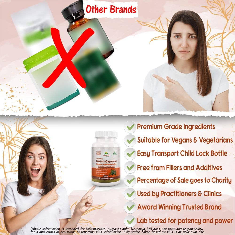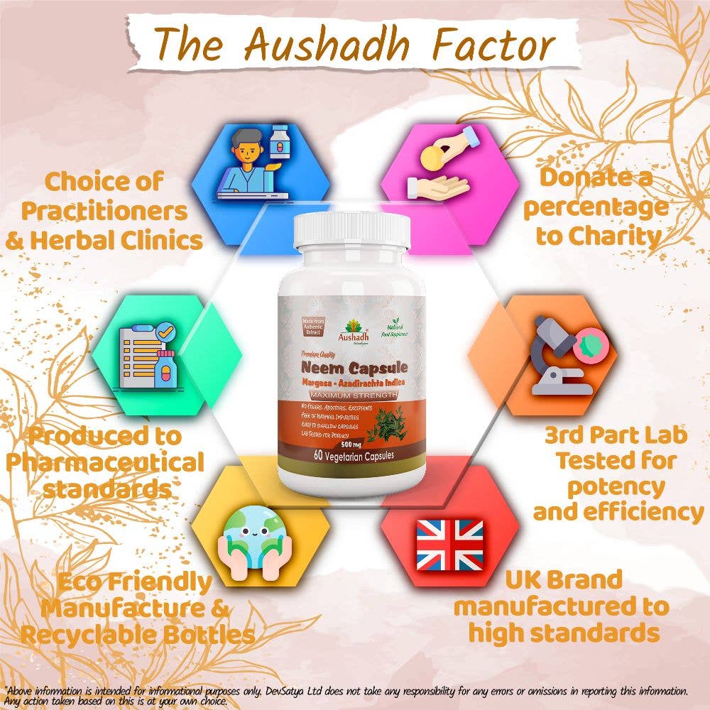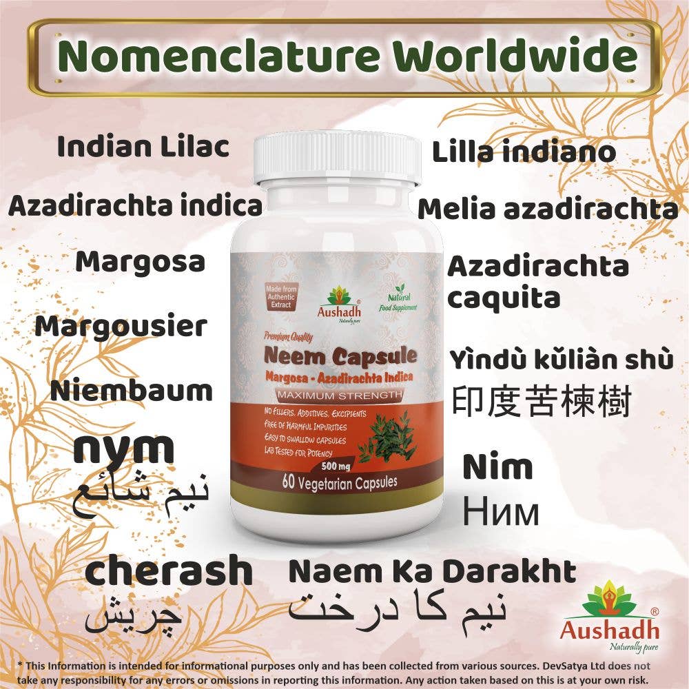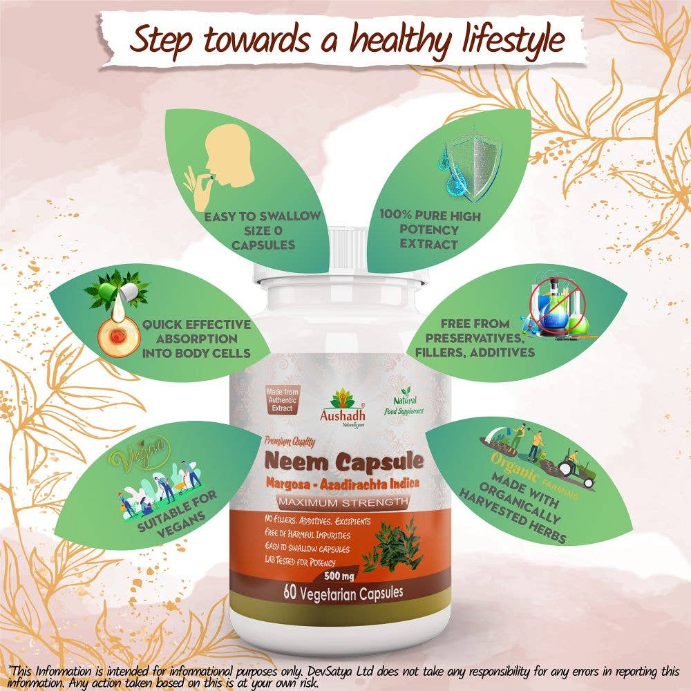 eem (Margosa) Kapsler fra Aushadh inneholder et høykonsentrert ekstrakt av neem (Azadirachta indica), en tradisjonell ayurvedisk urt kjent for sine kraftige antibakterielle og immunstyrkende egenskaper. Dette tilskuddet er spesielt formulert for å støtte hudens helse, fremme kroppens avgiftningsprosesser og bidra til en balansert fordøyelse. Neem er en naturlig blodrenser og kan bidra til å beskytte kroppen mot skadelige mikroorganismer.