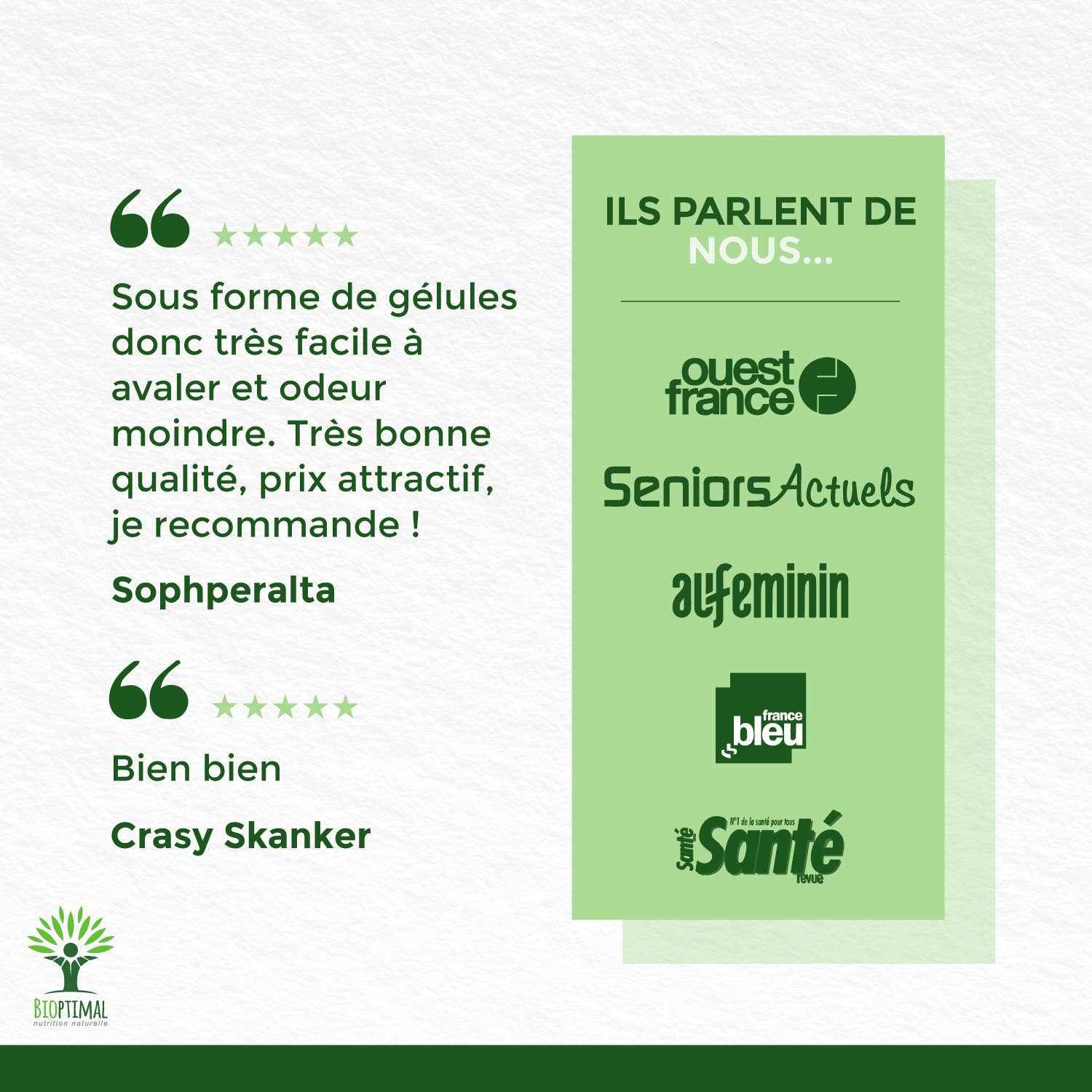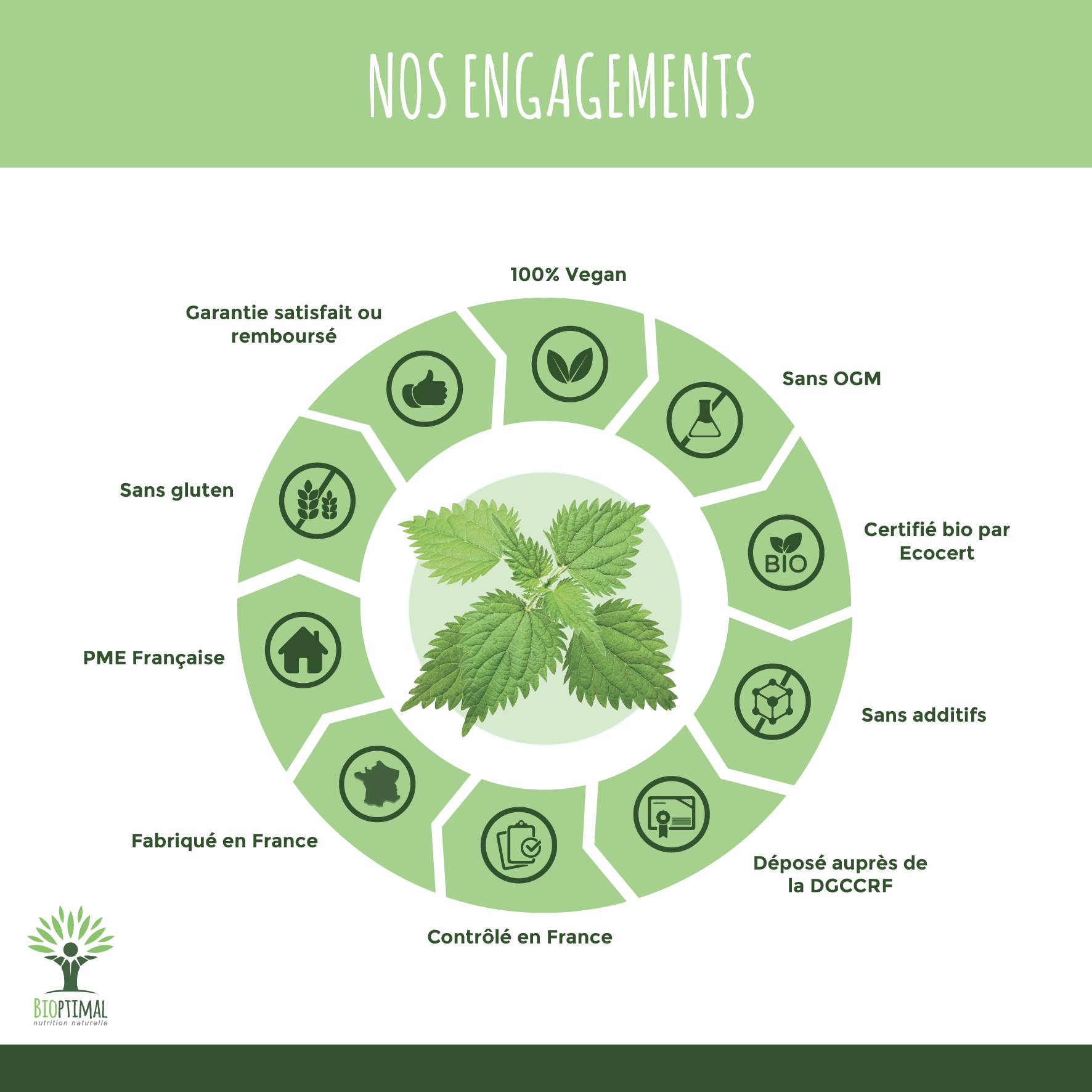 Bioptimal er et fransk, familieeid selskap som spesialiserer seg på naturlig ernæring. Med en visjon om å tilby rene, økologiske produkter uten unødvendige tilsetningsstoffer, fokuserer selskapet på kvalitet og bærekraft. Bioptimal prioriterer miljøvennlig produksjon med solenergibasert emballasje og lokale samarbeid. Deres verdier er transparens, renhet og miljøbevissthet.