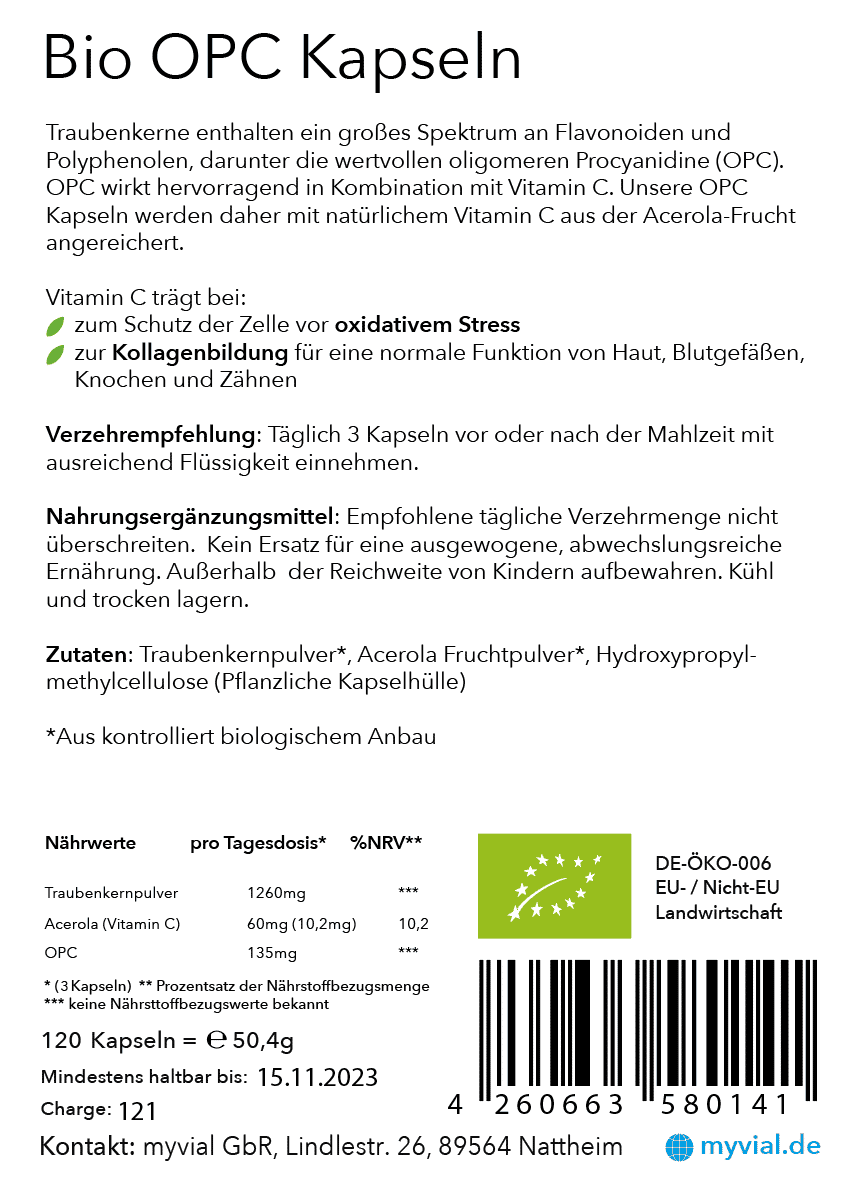 Økologisk OPC-kapsler druefrøpulver fra myvial er laget med 100 % økologisk druefrøpulver, økologisk acerola-pulver og vitamin C, og er et naturlig middel for å styrke kroppens forsvar. OPC er mye sterkere enn både vitamin C og E, og har en enestående evne til å bekjempe skadelige frie radikaler, som kan ødelegge friske celler og akselerere aldringsprosesser i kroppen. Dette produktet er derfor et perfekt valg for dem som ønsker å beskytte kroppens celler mot oksidativt stress.
