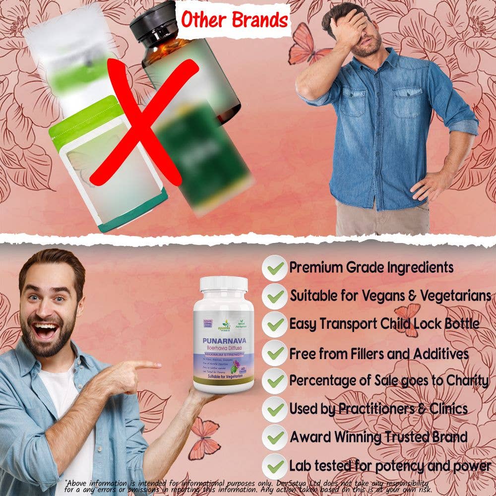 Støtter leverfunksjonen og avgiftning – Punarnava er kjent for sin evne til å støtte leverens naturlige avgiftningsprosesser, noe som kan være gunstig for å eliminere giftstoffer fra kroppen. Ved å fremme en sunn leverfunksjon kan urten bidra til bedre fordøyelse, økt energi og en sterkere metabolisme. Dette kan også bidra til å forbedre hudhelsen, da leveren spiller en viktig rolle i kroppens evne til å kvitte seg med avfallsstoffer som ellers kan føre til hudproblemer som akne og eksem.