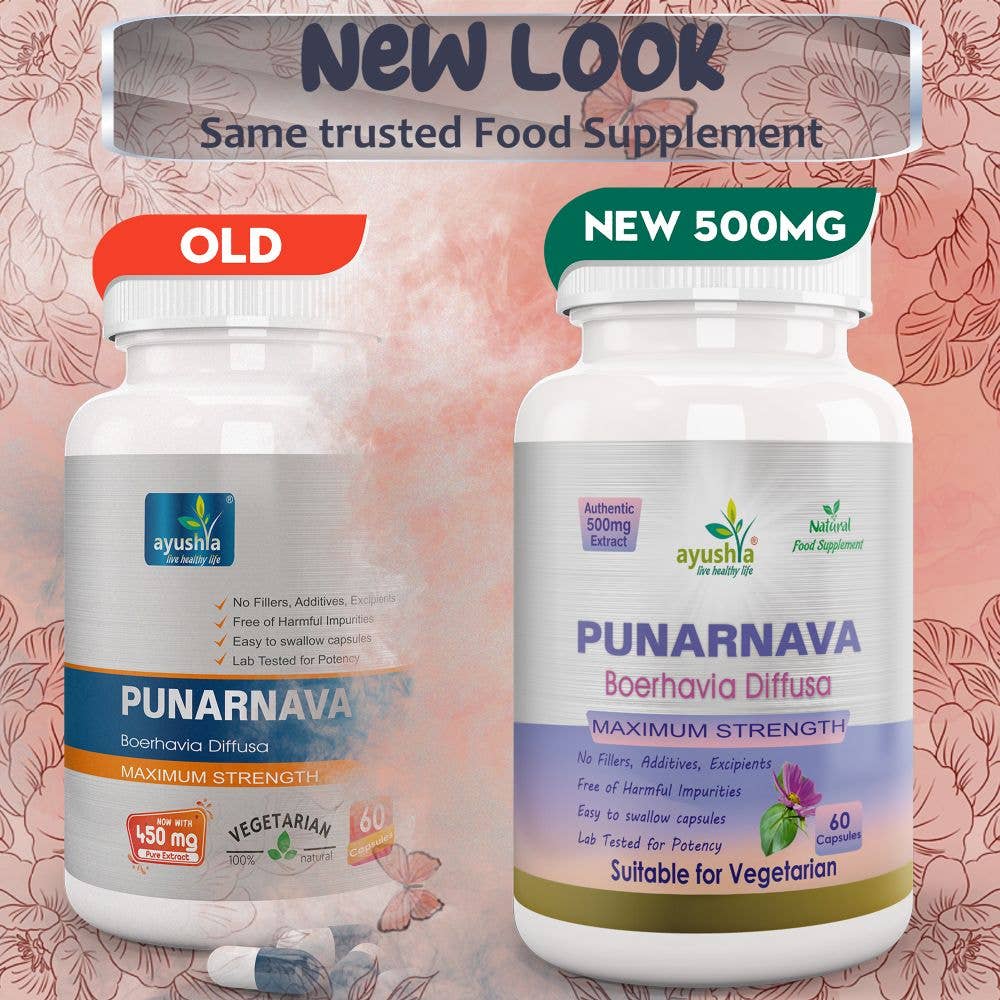 Punarnava (Boerhavia diffusa) ekstrakt – 500 mg per kapsel. Kapselskallet er laget av vegetabilsk cellulose (hydroksypropylmetylcellulose)