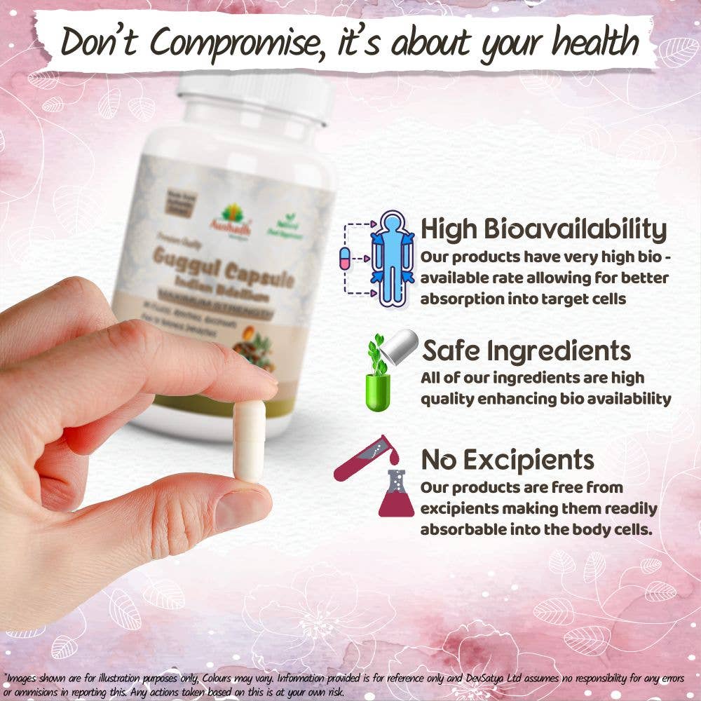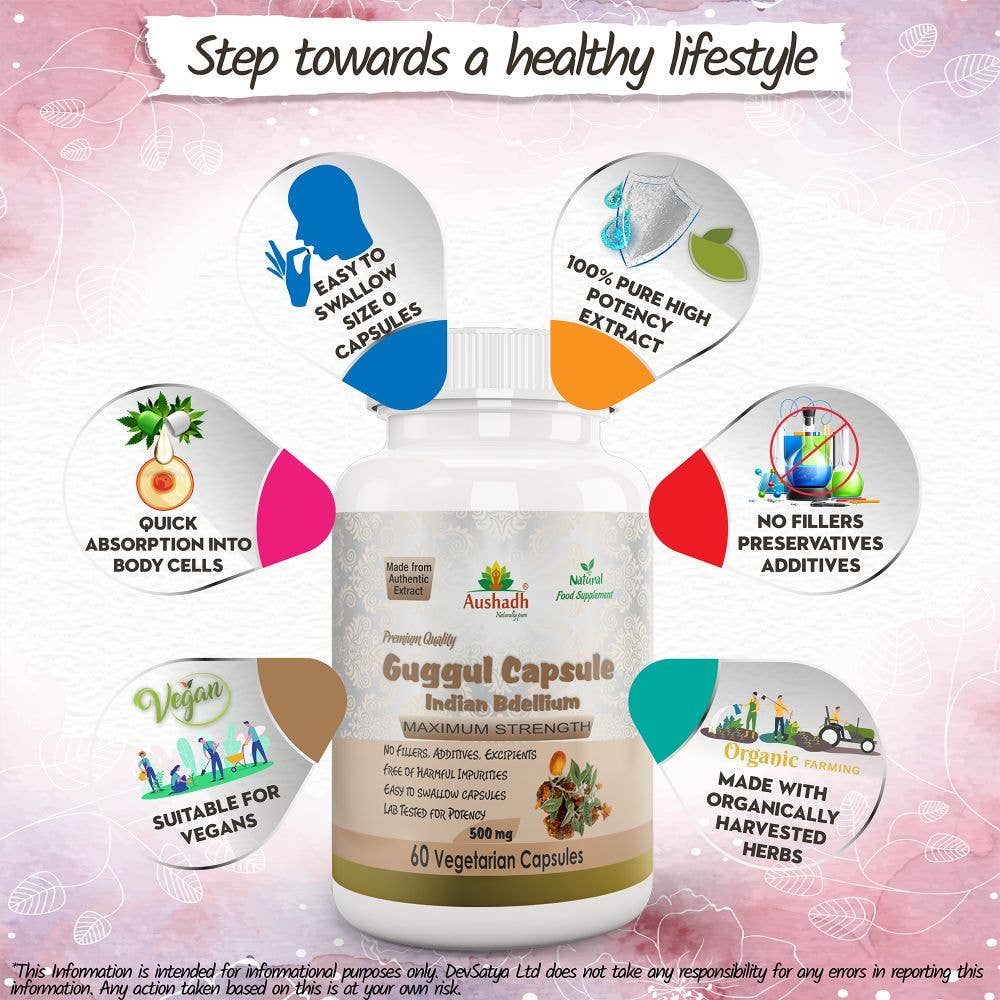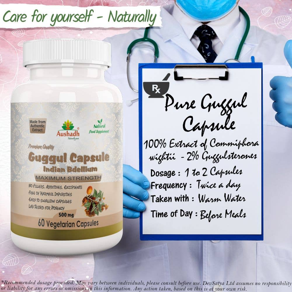 Guggul 60 kapsler med styrke 500 mg fra Aushadh er et naturlig kosttilskudd basert på Commiphora mukul, en harpiks kjent for sine kraftige helsefordeler. Guggul har vært brukt i ayurvedisk medisin i århundrer for å støtte en sunn lipidbalanse, fremme avgiftning og bidra til metabolsk helse. Denne rene formuleringen fra Aushadh inneholder høykvalitets guggulekstrakt med høy biotilgjengelighet, uten unødvendige tilsetningsstoffer. Tilskuddet kan bidra til en sunn hjertehelse, støtte normal kolesterolbalanse og fremme vektkontroll gjennom økt fettmetabolisme.