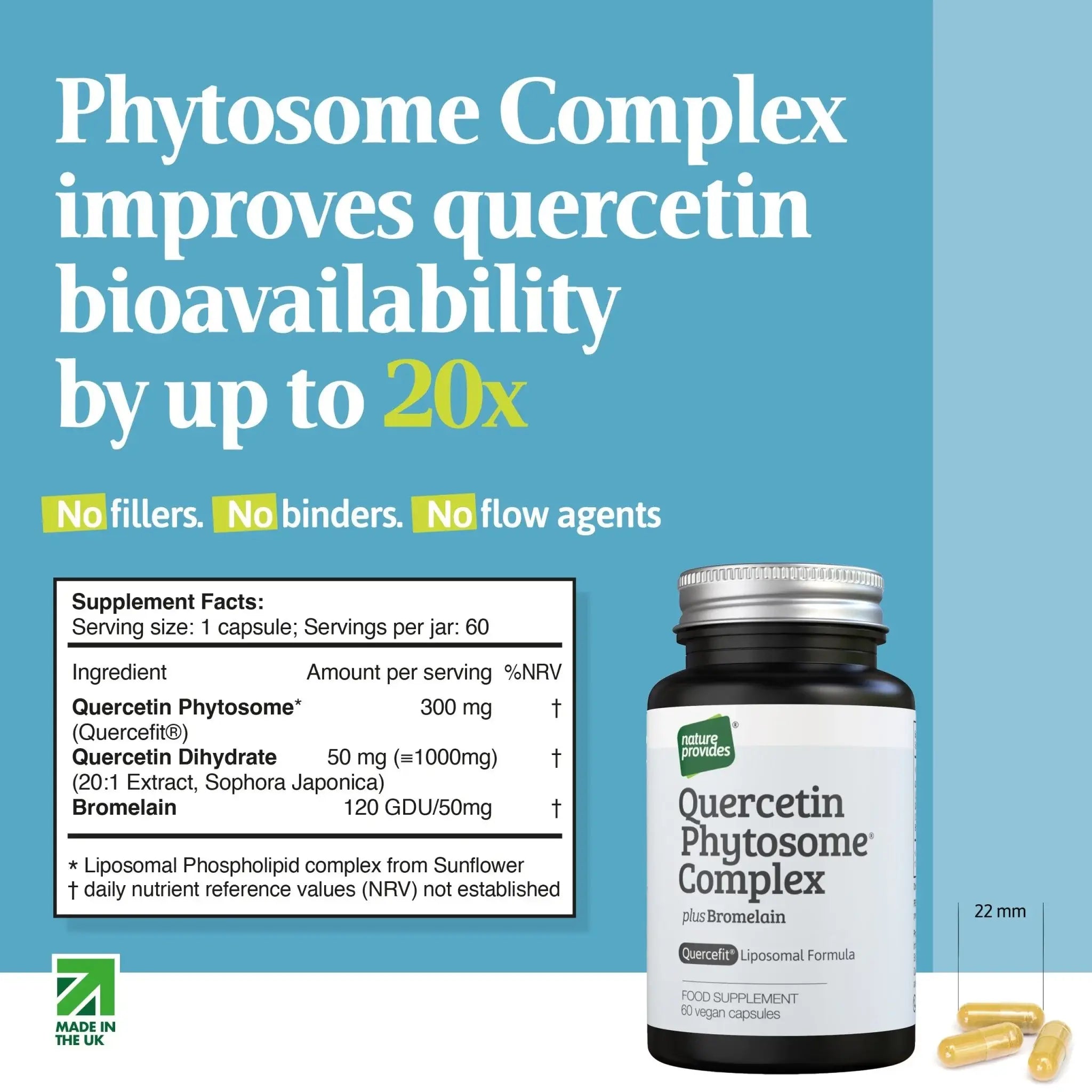 Quercetin Phytosome® fra Nature Provides kombinerer Quercetin Phytosome® med bromelain for å forbedre biotilgjengeligheten og effektiviteten. Produktet er 100 % rent, uten fyllstoffer, bulkemidler, flytende midler eller konserveringsmidler, og leveres i veganske kapsler, noe som gjør det egnet for både veganere og vegetarianere. Quercetin er kjent for å støtte immunforsvaret, fremme sunn aldring, balansere blodsukkernivået og gi allergi- og luftveissupport.