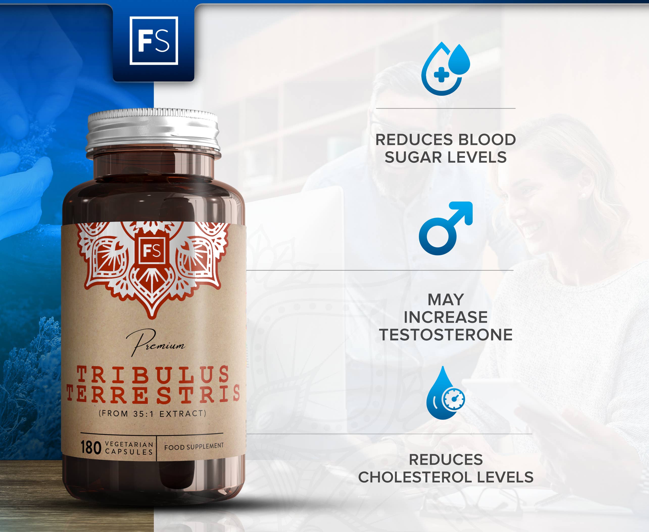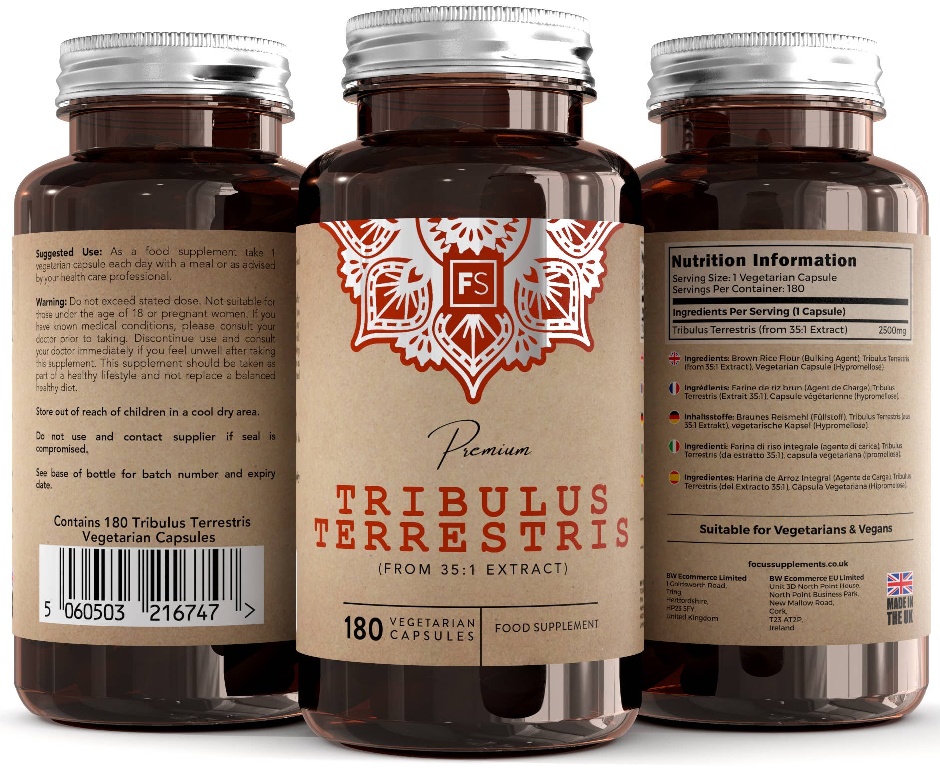 Tribulus Terrestris 35:1 Extract – 180 kapsler (2500 mg). Dette kosttilskuddet fra Focus Supplements inneholder 2500 mg høykonsentrert Tribulus Terrestris-ekstrakt per kapsel, tilsvarende 87 500 mg aktiv plante per daglig dose. Tradisjonelt brukt i kinesisk og indisk medisin for å støtte urinveiene, testosteronnivåer og libido, er Tribulus Terrestris nå populært som et generelt helsetilskudd. Produktet er egnet for vegetarianere og veganere, og er fri for melk, gluten og kunstige tilsetningsstoffer.