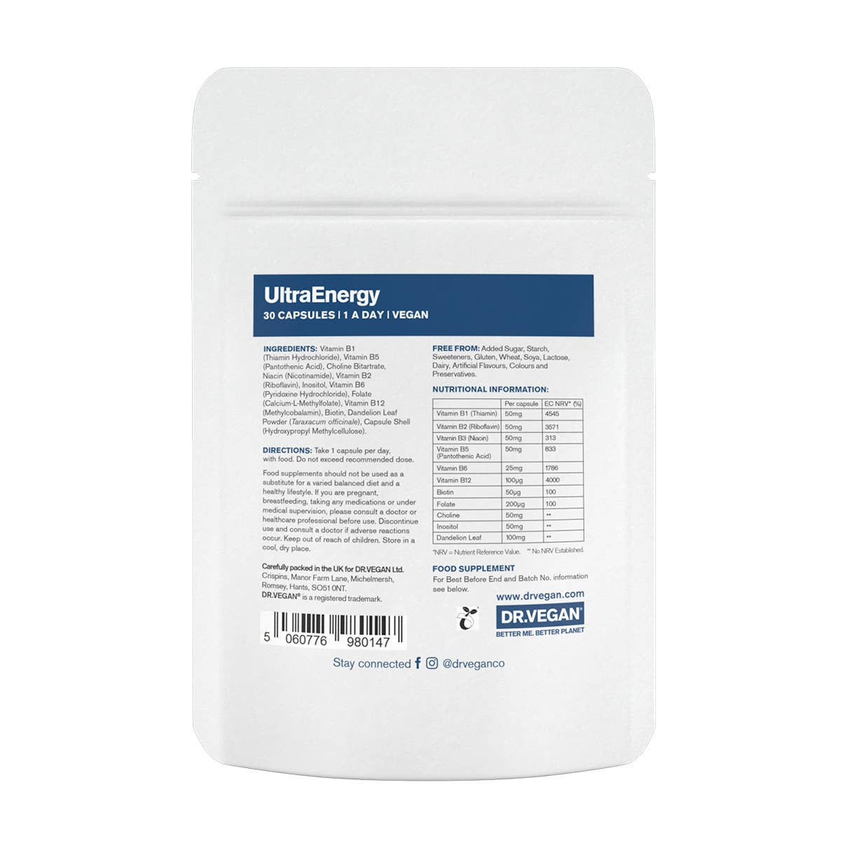 UltraEnergy fra DR.VEGAN er et kosttilskudd utviklet for å fremme energinivåer og redusere tretthet gjennom en unik kombinasjon av B-vitaminer, kolin, inositol og løvetannbladekstrakt. Denne blandingen er utformet for å gi langvarig energi uten koffein eller tilsatte sentralstimulerende midler, noe som gjør det ideelt for daglig bruk uten risiko for krasj.