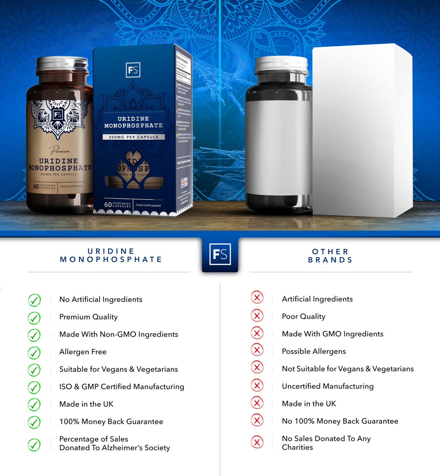 Forskning viser til at Uridin, gjennom omdannelsen til cytidintrifosfat (CTP), forbedrer fosfolipidsyntese i hjernen, og øker nivåene av fosfomonoestere (PME) som er avgjørende for membranintegritet og funksjon, og potensielt er til fordel for kognitive prosesser og energimetabolisme.