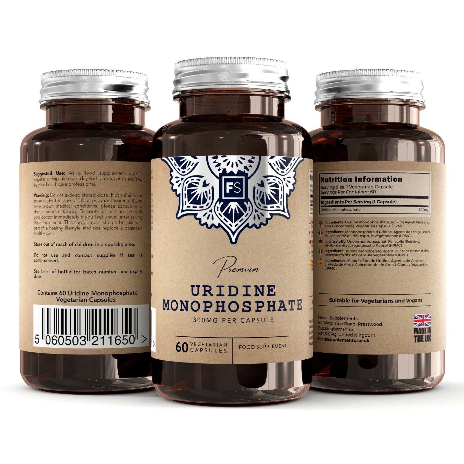 Uridine Monophosphate 300 mg 60 kapsler. Dette kosttilskuddet fra Focus Supplements er designet for å støtte hjernens helse og kognitive funksjoner. Med 300 mg uridinmonofosfat per kapsel bidrar det til å forbedre hukommelse, fokus og mental klarhet. Produktet er vegansk, allergenfritt, og inneholder ingen kunstige fargestoffer eller smakstilsetninger.