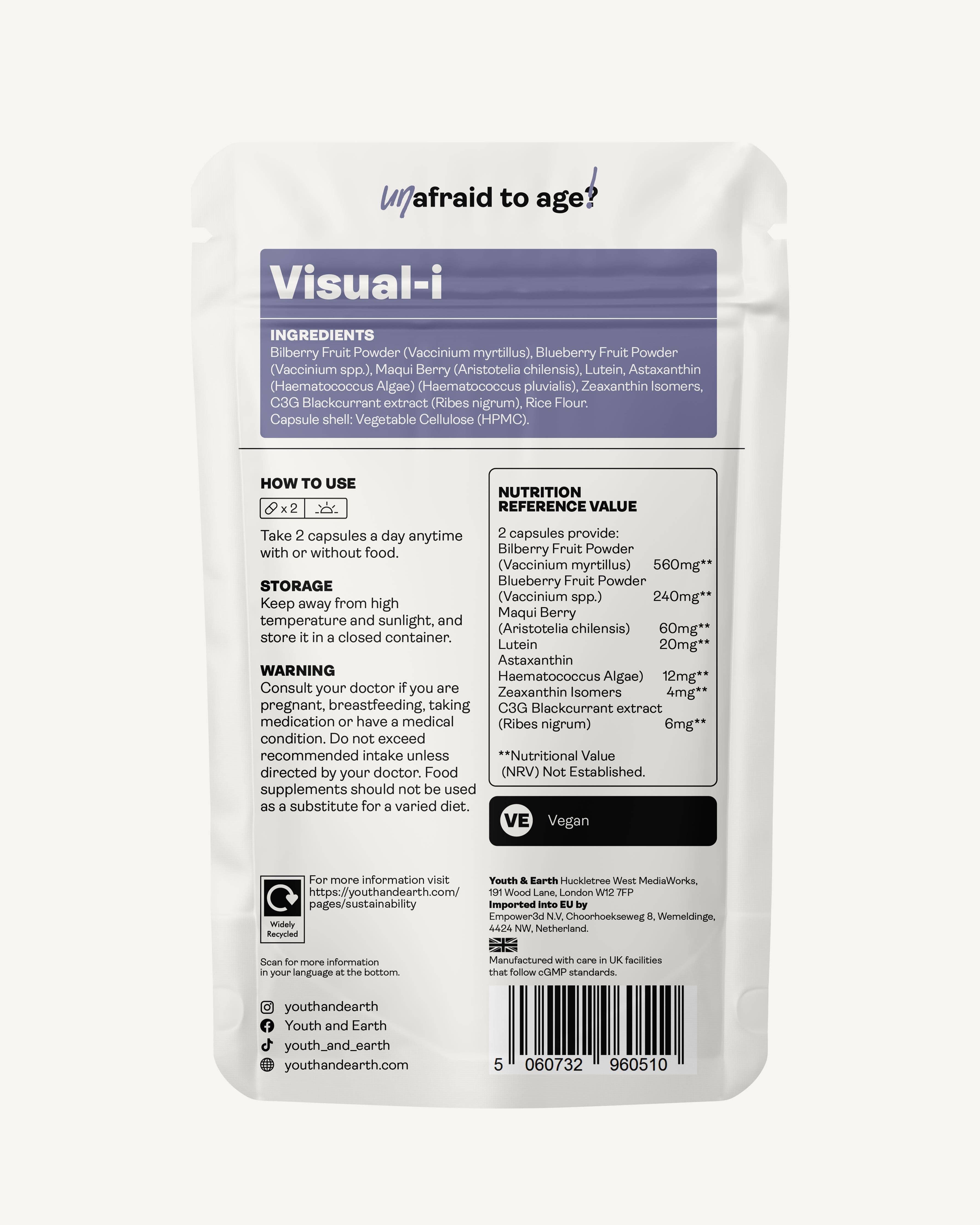 Visual-i 60 kapsler fra Youth & Earth er et nøye sammensatt kosttilskudd designet for å støtte optimal øyehelse, spesielt med tanke på utfordringene som følger med vår skjermfokuserte hverdag. Dette tilskuddet kombinerer flere naturlige ingredienser kjent for sine positive effekter på synet; blåbær- og blåbærfruktpulver, Maqui-bær, Astaxanthin, og Lutein og zeaxanthin.