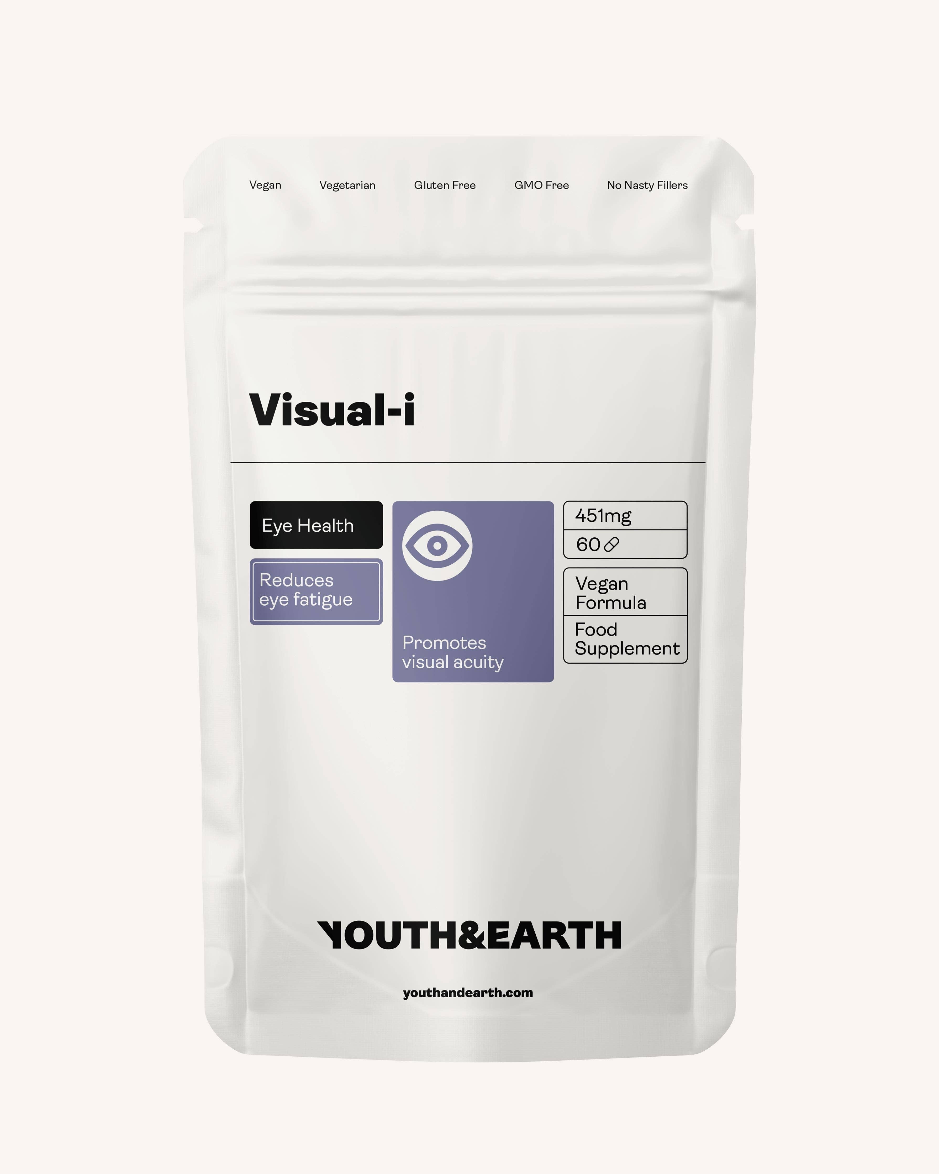 Visual-i er en vegansk og glutenfri formel som ikke bare forbedrer generell synsklarhet, men også lindrer tørre øyne, reduserer øyefatigue, optimaliserer nattsyn og beskytter mot oksidativt stress.